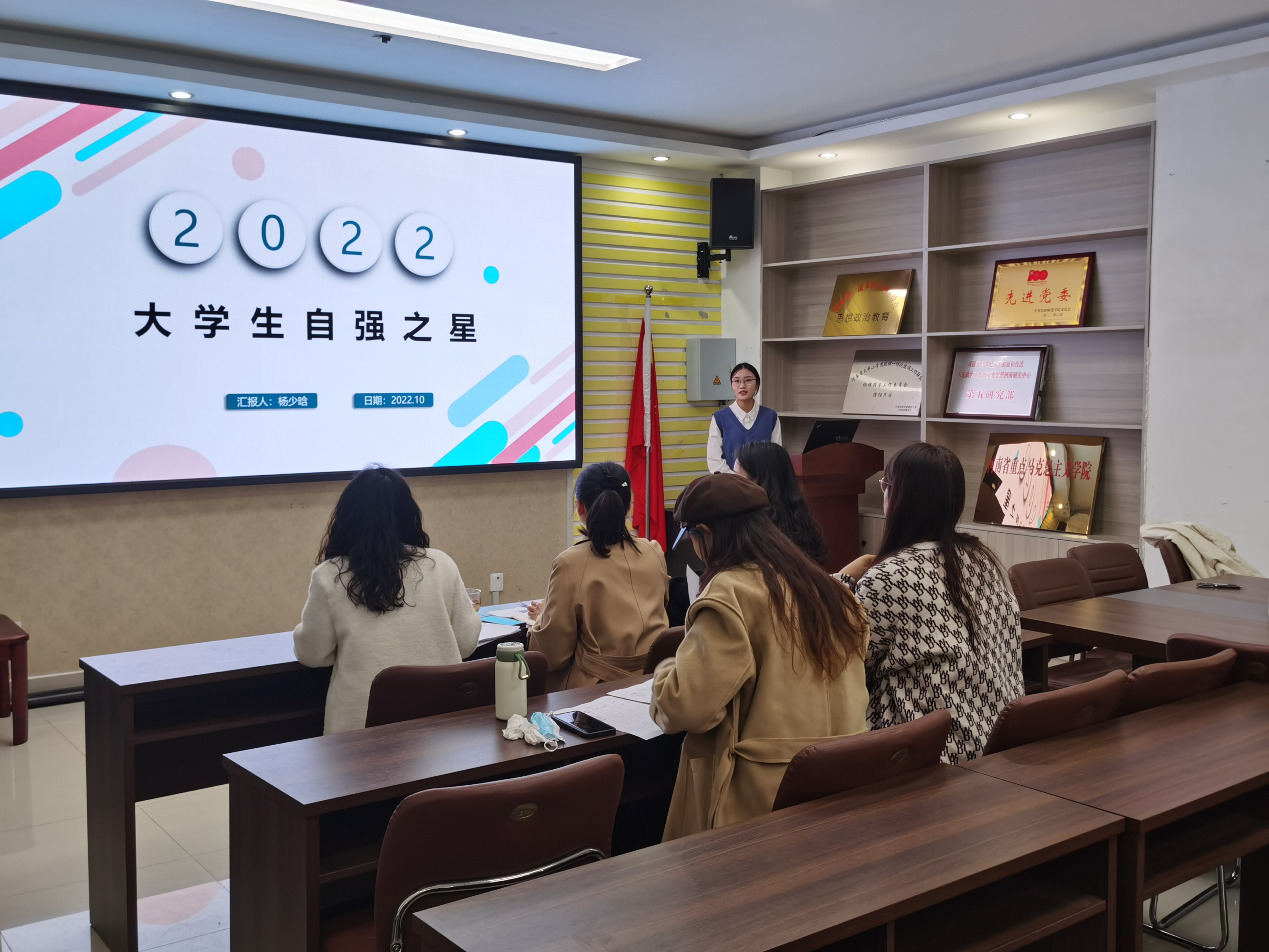 为深入贯彻落实习近平总书记关于青年工作的重要思想,鼓励青年践行“强国有我”的青春宣言,10月26日上午,ok138cn太阳集团529在社科楼323会议室举办了“大学生自强之星”候选人评选活动,我院团委书记陶青青,专职组织员任婷,班主任王明园、杨春艳、吴梦云出席活动并担任评委。活动由组织部负责人韩奕晨主持。