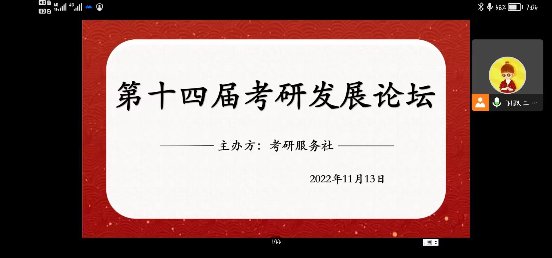 功不唐捐,玉汝于成。11月13日晚上,由ok138cn太阳集团529考研服务社组织的第十四届考研发展论坛在线上顺利举行。聚星文登考研指导老师吕明明、校学生会社团部及百名学子共同参加本次论坛。活动由朱钰阁、李雪静主持。