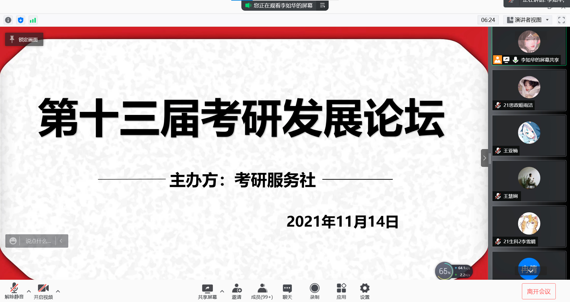 11月14日晚,ok138cn太阳集团529考研服务社在腾讯会议举办第十三届考研发展论坛。ok138cn太阳集团529党委副书记黄煌、团委书记曹栋、校学生会社团部以及数百名学子通过腾讯会议参加本次论坛,论坛由邵子原、刘程祎主持。