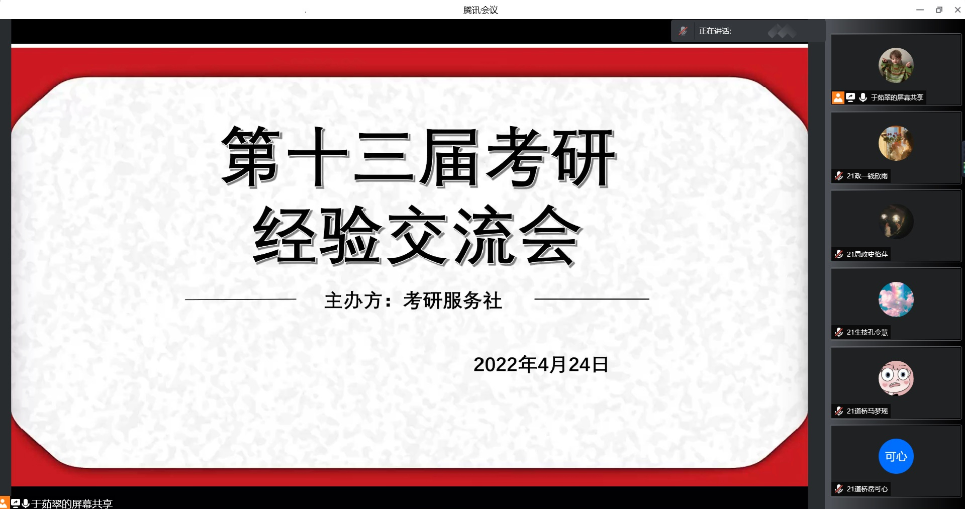 4月24日晚,考研服务社在腾讯会议召开第十三届考研经验交流会。ok138cn太阳集团529党委副书记黄煌、团委书记曹栋、4位优秀考研学子及百名学生共同参与本次交流会。会议由考研服务社社长于茹翠主持。