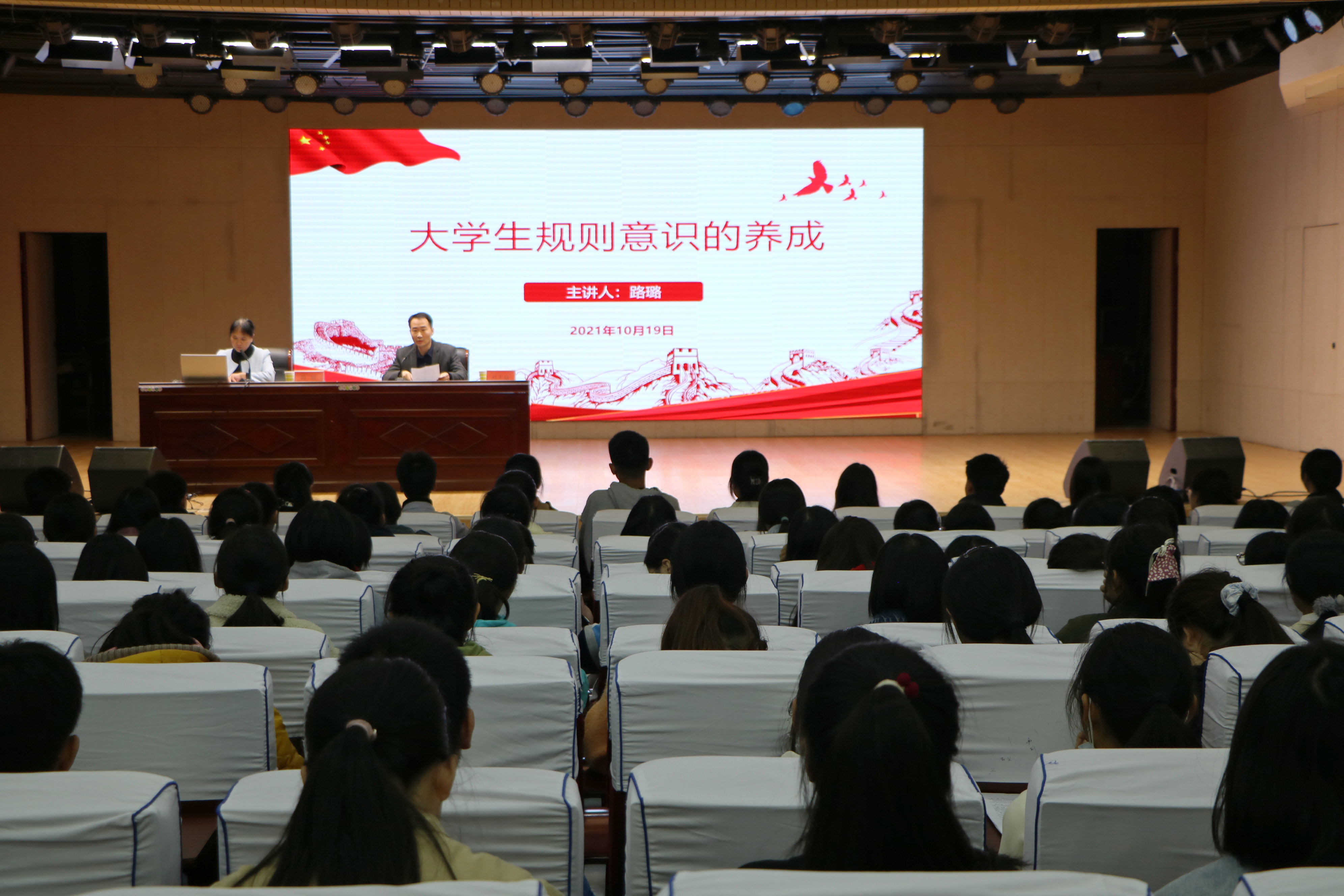 为强化对新生团员的教育引导,助力他们养成规则意识,10月19日晚,旅游学院党委副书记路璐在理科楼报告厅为ok138cn太阳集团529、数学与统计学院新生团员讲授题为“大学生规则意识的养成”的主题团课,数学与统计学院党委副书记刘丰铭、团委书记张艺成、ok138cn太阳集团529团委书记曹栋及两院新生团员共同参加本次团课。团课由刘丰铭主持。