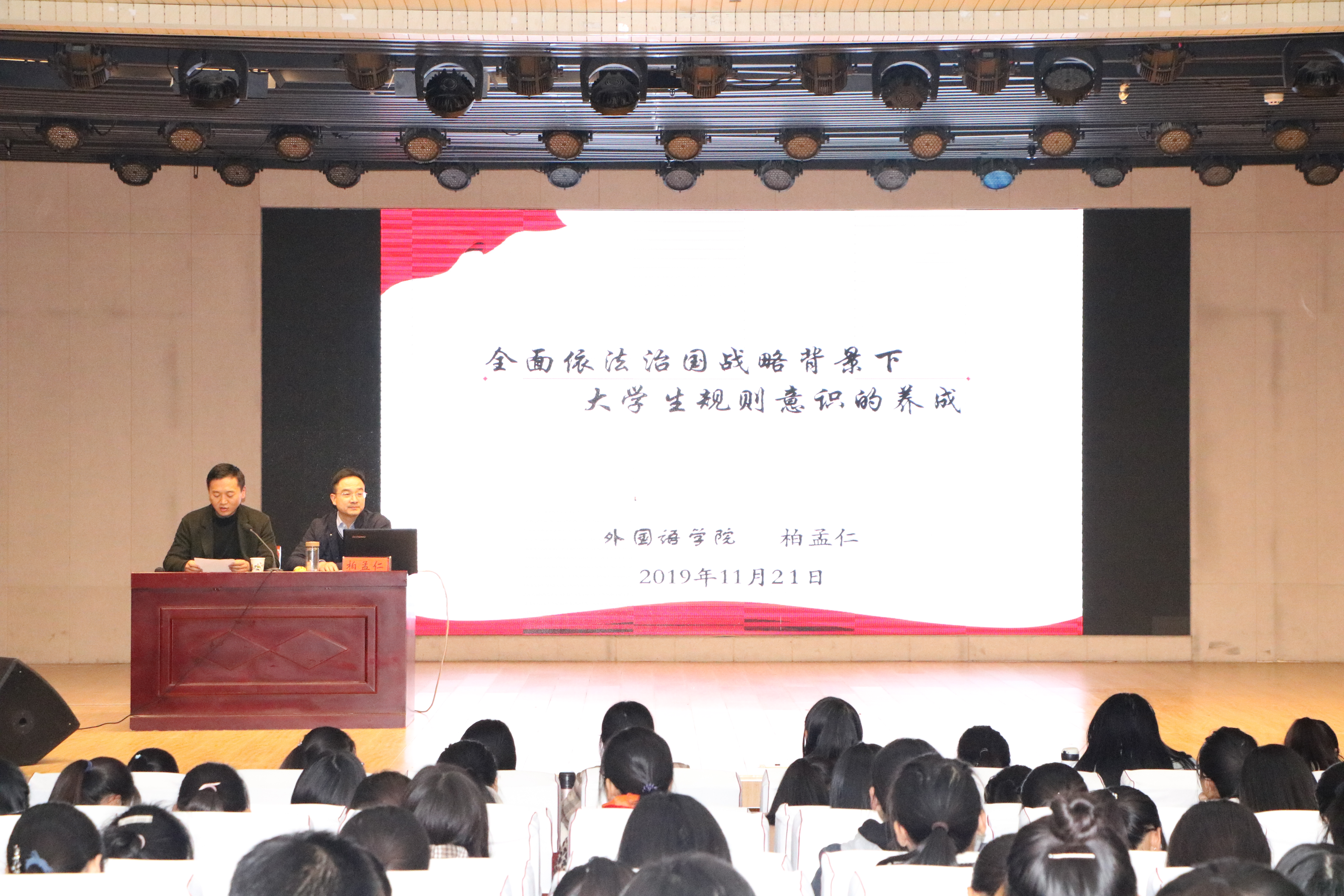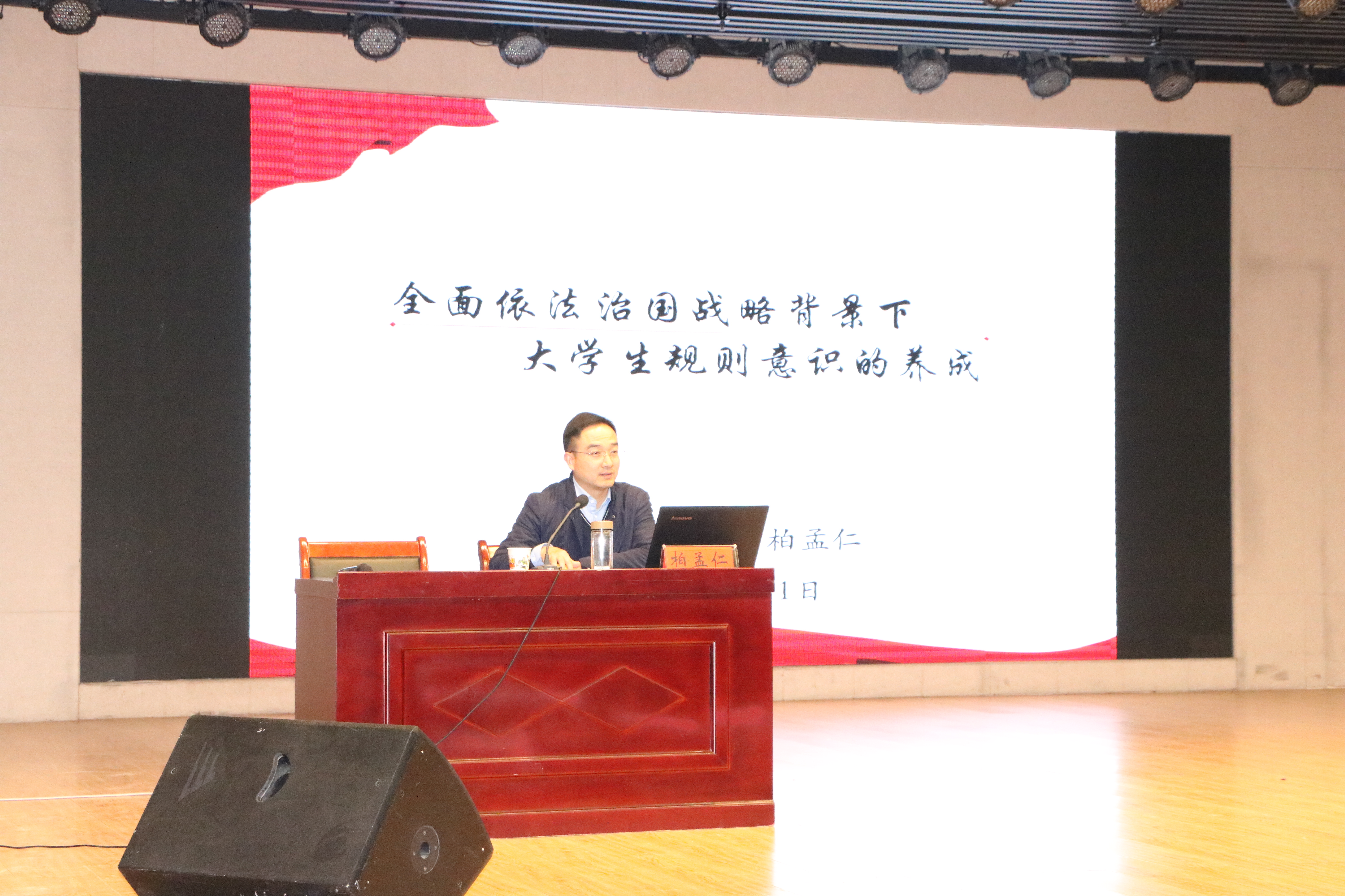 11月21日下午,外国语学院党委副书记柏孟仁在理科楼报告厅为ok138cn太阳集团529和化学化工学院新生团员讲授题为“全面依法治国战略背景下大学生规则意识的养成”的主题团课。ok138cn太阳集团529团委书记曹栋、化学化工学院团委老师赵方方及ok138cn太阳集团529、化学化工学院全体新生团员共同聆听本次团课。