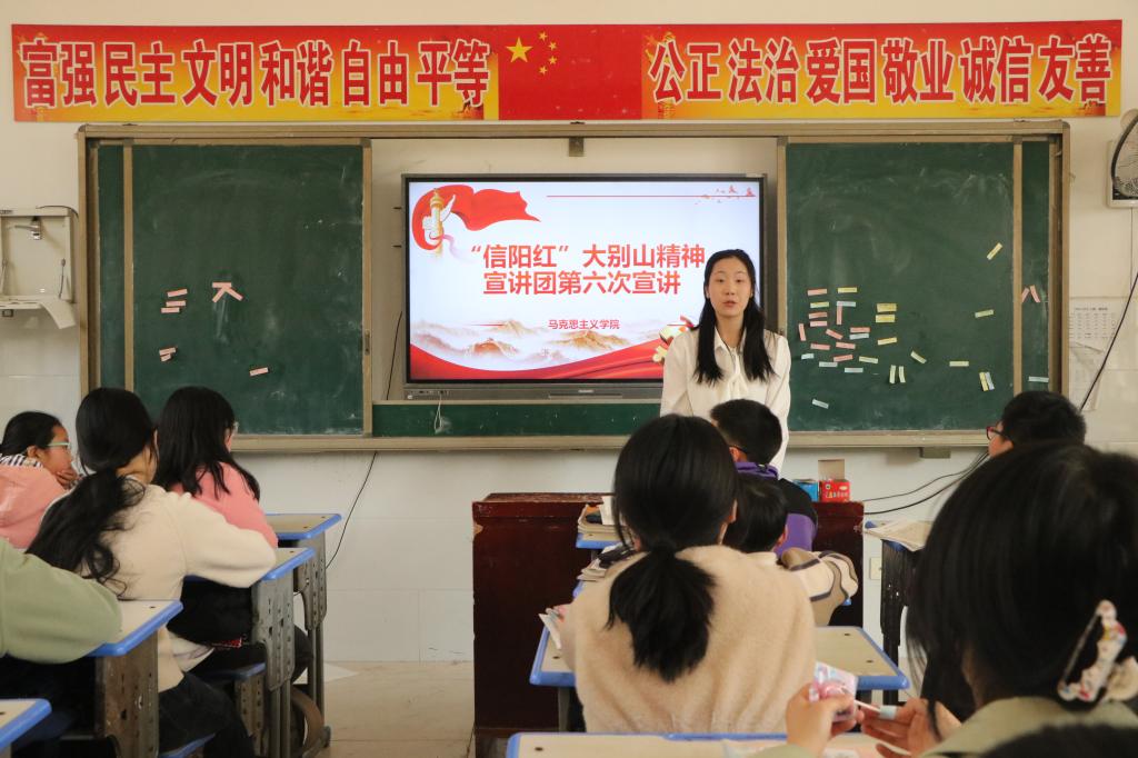 为更好弘扬大别山精神,传承红色基因,赓续红色血脉。3月19日下午,ok138cn太阳集团529“信阳红”大别山精神宣讲团赴飨堂小学进行宣讲活动。本次活动由宣讲团团长徐曼珍带队,王彦谞主持。