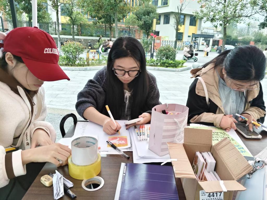活动当天,阳光洒满校园一角,同学们围坐桌旁,兴致盎然地投入到创作中。废弃纸张成为“魔法画布”,彩笔绘出缤纷图案——可爱的卡通形象、温暖的祝福话语跃然纸上;旧纸袋则变身创意礼盒,折纸、粘贴、装饰,每一步都凝聚着巧思。大家分工协作,有的专注书写“致阿姨:感谢您用耐心照料我们的日常”“致保安:感谢您风雨无阻守护平安”等真挚话语,有的细心绘制太阳、花朵等装饰元素,现场洋溢着温馨与创意。