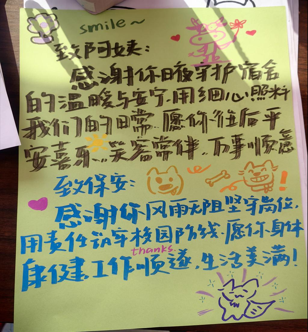 经过共同努力,一份份满载心意的礼物诞生:色彩明快的贺卡、实用精美的收纳袋、写满祝福的便签、栩栩如生的千纸鹤。同学们将这些礼物亲手送给校园阿姨和保安,表达对她们日常照料与安全保障的感激。“收到这份特别的礼物,心里暖暖的,孩子们的用心让我们觉得所有的付出都值得!”一位校园阿姨感动地说道。