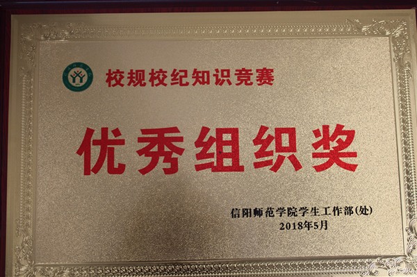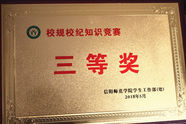 由我院黄锦、侯怡、陈艳桃、李雅楠四名同学组成的代表队,在由信阳师范学院学生工作处(部)主办、教师教育学院承办的校规校纪知识竞赛中表现优异,荣获“三等奖”和“优秀组织奖”。