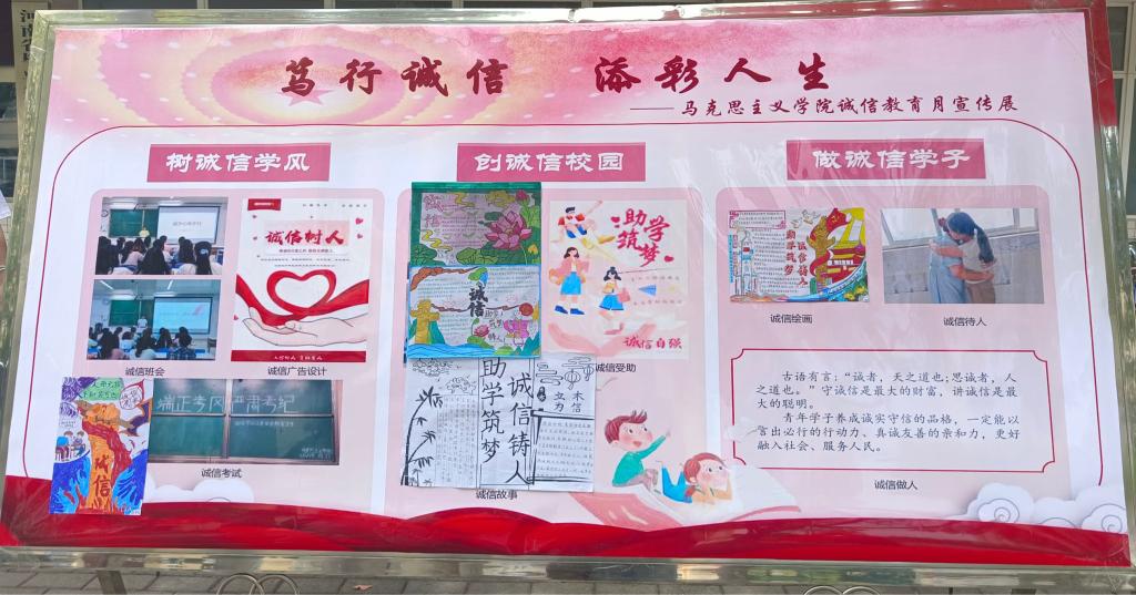 本次比赛主要是以绘画艺术的形式,进行诚信教育宣传。比赛前期,通过推文、QQ等多种形式的活动预告宣传,我院青年学子踊跃报名并认真准备手抄报的制作。比赛期间,参赛者们围绕诚信宣传的主题,采用绝妙的色彩搭配 ,以独特的创作视角 、新颖的思维观点共同呈现出了完美的手抄报作品,为我们展现了诚信的重要性和必要性。比赛结束后,参赛同学的作品在ok138cn太阳集团529诚信教育宣传展报上进行了展示。