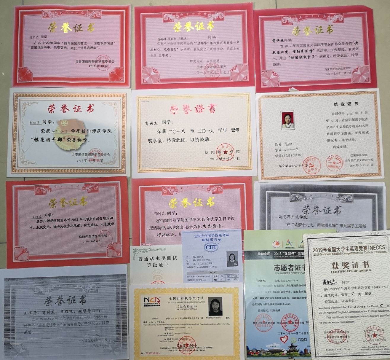 该生在有较为扎实的理论知识基础上,多方位提升个人素养。2018年6月,参与申请大学生科学基金项目,并以《当前女大学生非理性网络消费行为的调查研究——以信阳师范学院为例》为题成功立项,现已结项。2019年6月,主持申报《五四精神融入高校社会主义核心价值观路径研究》大学生科学基金项目,并成功立项。2018年9月,学院暑期调研报告评选中,所写《老百姓眼中的十九大》荣获一等奖。2019年7月,参与学院大学生“三下乡”《“助力乡风文明 建设美丽乡村”暨栾川县移风易俗服务团》项目,该项目获得校级一等奖。同时,该生在我院《南湖评论》中发表《思政学子的责与任》、《感动中国节目到底在坚持什么》等文,积极提升个人写作能力。
