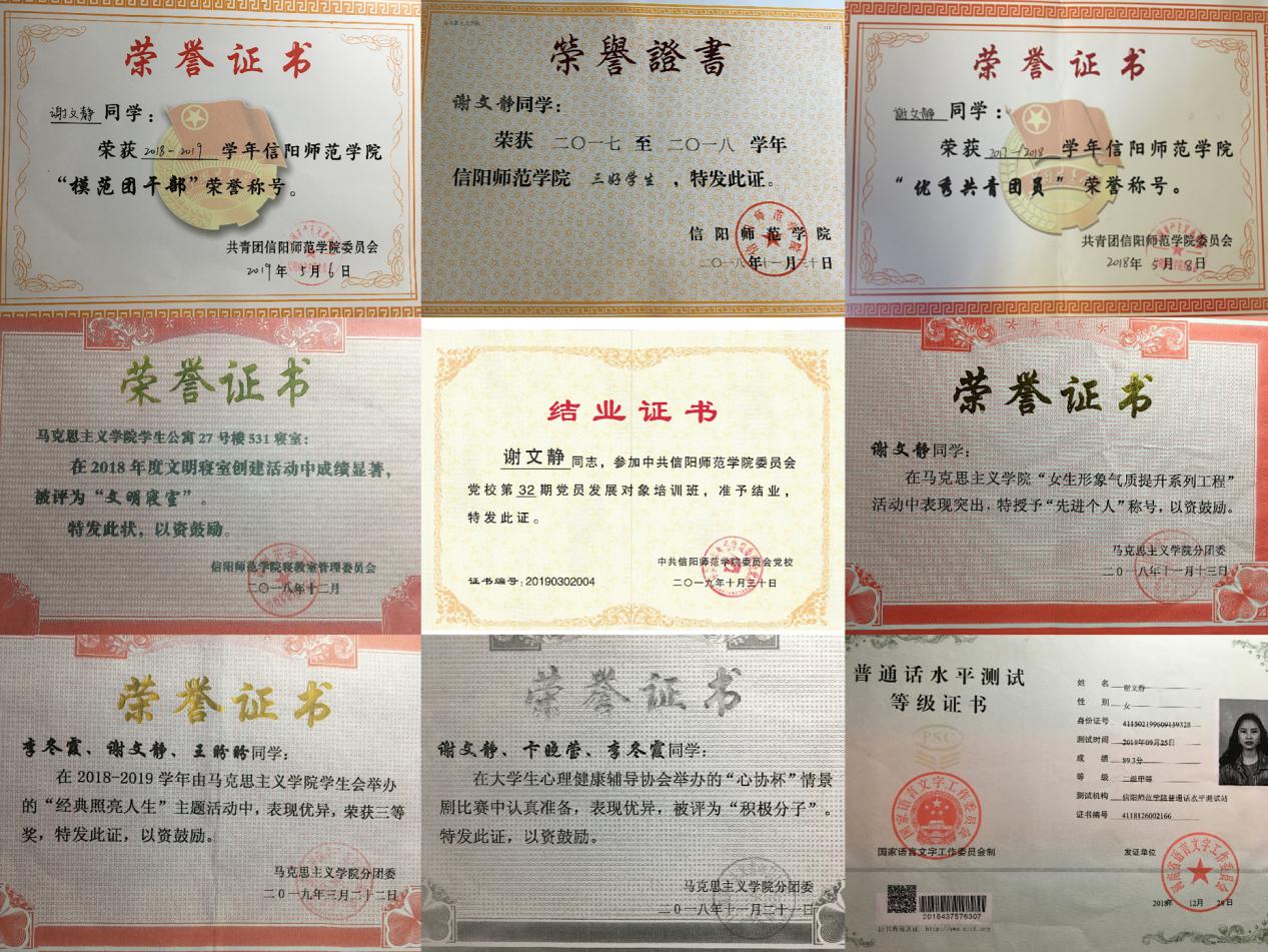 谢文静,女,河南信阳人,1998年9月出生,中共预备党员,信阳师范学院ok138cn太阳集团529本科2017级思想政治教育一班的学生。现任2017级思想政治教育一班团支书和心理委员。该生乐于奉献,团结同学,思想端正,具有坚定的理想信念,政治立场坚定。