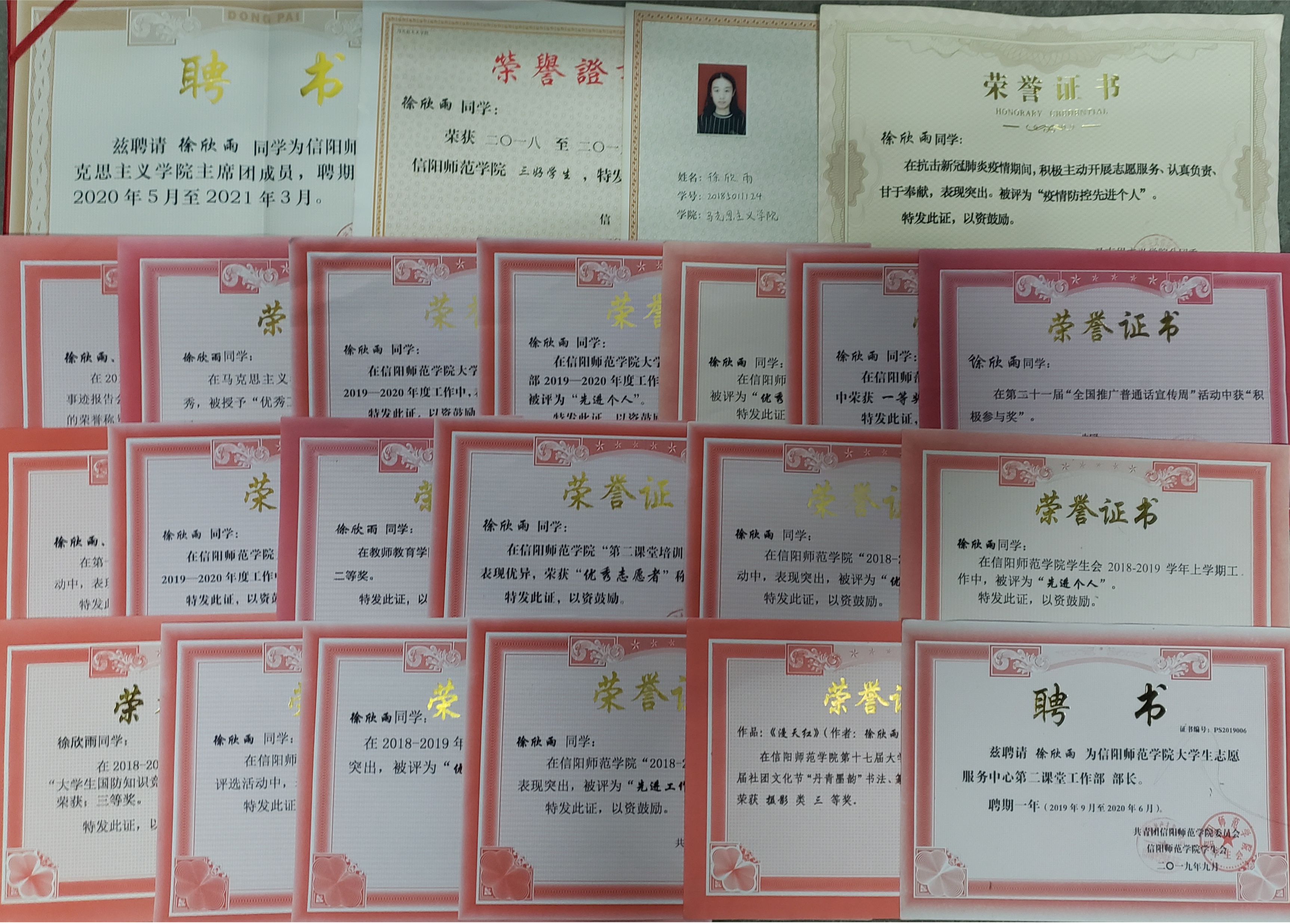 该生积极为学院同学服务,自履职以来始终以不忘初心、不辜负每一张选票为准则,全新全意为学院同学服务,力所能及帮助学院同学解决生活学习困难,同时高质量高标准完成学院任务,协助老师与同学沟通与交流,发挥自身桥梁作用。积极组织、服务学校及学院多项活动,例如信阳师范学院迎新活动、信阳师范学院元旦晚会、信阳师范学院“诗词大会”、信阳师范学院首届社团嘉年华活动、信阳师范学院第八届“十佳教师”活动、信阳师范学院第十届“明星社长”活动等活动。曾获荣誉如“三好学生”、“模范干部”、“优秀工作者”、“优秀志愿者”等。