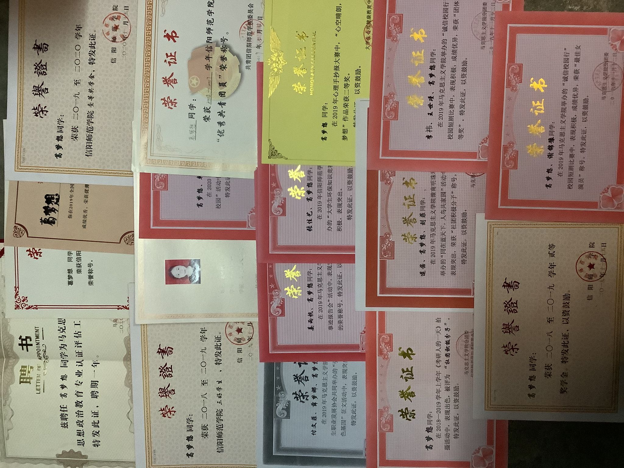 知识无止境,学习更无止境。作为学生,时刻把学习当作自己的第一任务,积极投入到各门基础课和专业课的学习中,上课认真听讲,保质保量完成作业,课余时间定期进行专业所需的课外阅读,学习目标明确,态度端正,锐意进取。不断提高自身写作能力,积极撰写《青年大学生应勇担时代责任》、《学英烈故事,扬大别山精神》等文章,并在《南湖评论》上发表。大一大二学年分别荣获校级二等奖学金、校级一等奖学金。在学习技能考试中,荣获2019年全国大学生英语竞赛优秀奖,顺利通过英语四级考试、普通话水平测试。在信阳师范学院2019年“挑战杯”大学生课外学术科技作品竞赛中,所属团队作品《关于当代大学生消费情况的调研报告——以信阳师范学院为例》荣获河南省三等奖,荣获2018-2019年度信阳师范学院“三好学生”荣誉称号。