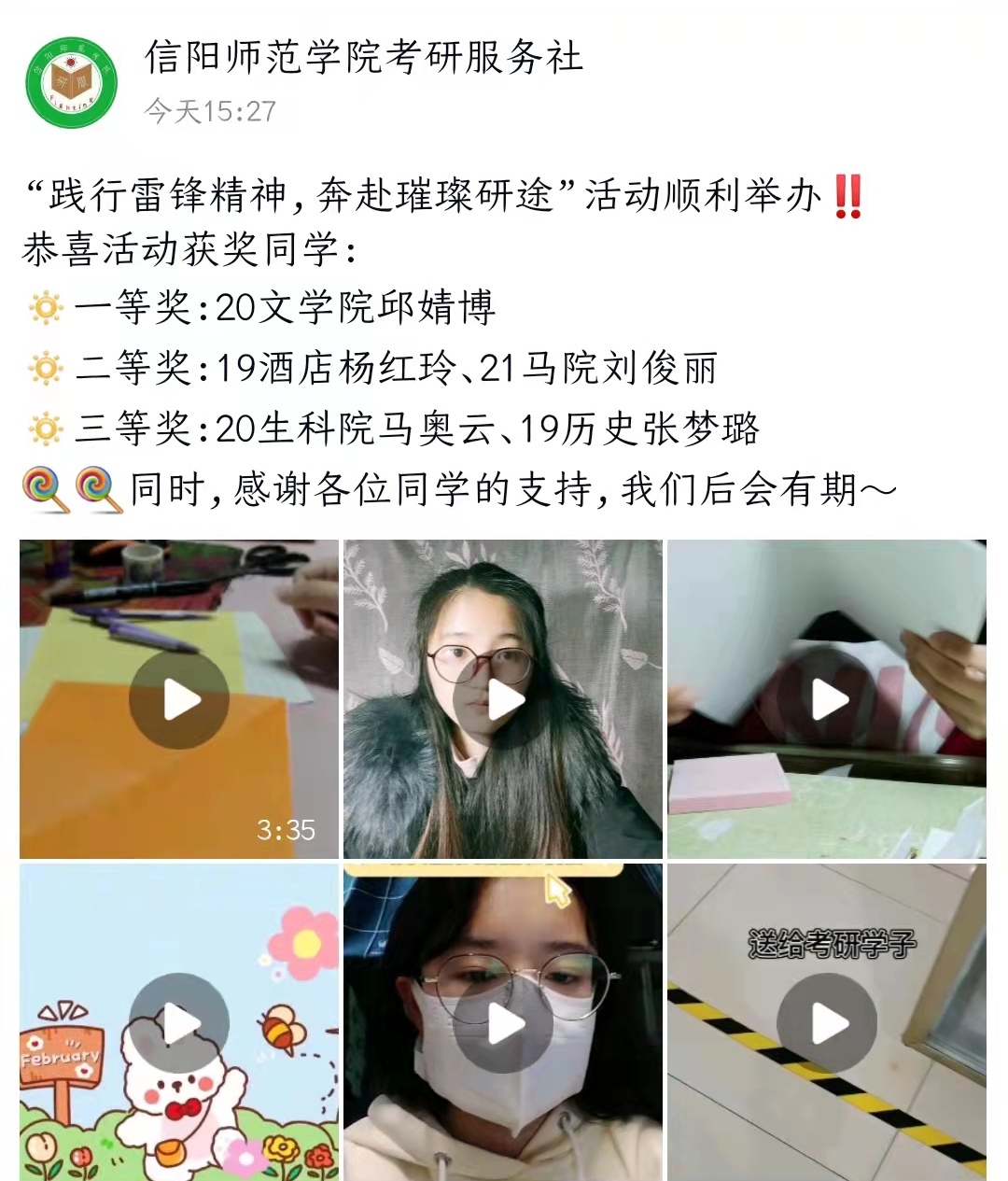 活动开始前,考研服务社网宣部进行活动信息宣传。活动开始后,相关负责人进行报名人员信息收集、到梦空间录取、作品收集及评比等工作的安排。活动期间,活动负责人收集考研学子疑难问题,并通过QQ和微信公众号进行解疑答惑,参与人员录制短视频,激励考研人。活动结束后,社团成员整理祝福视频,通过网络播放视频,将同学们对考研学子的美好祝愿进行传递。