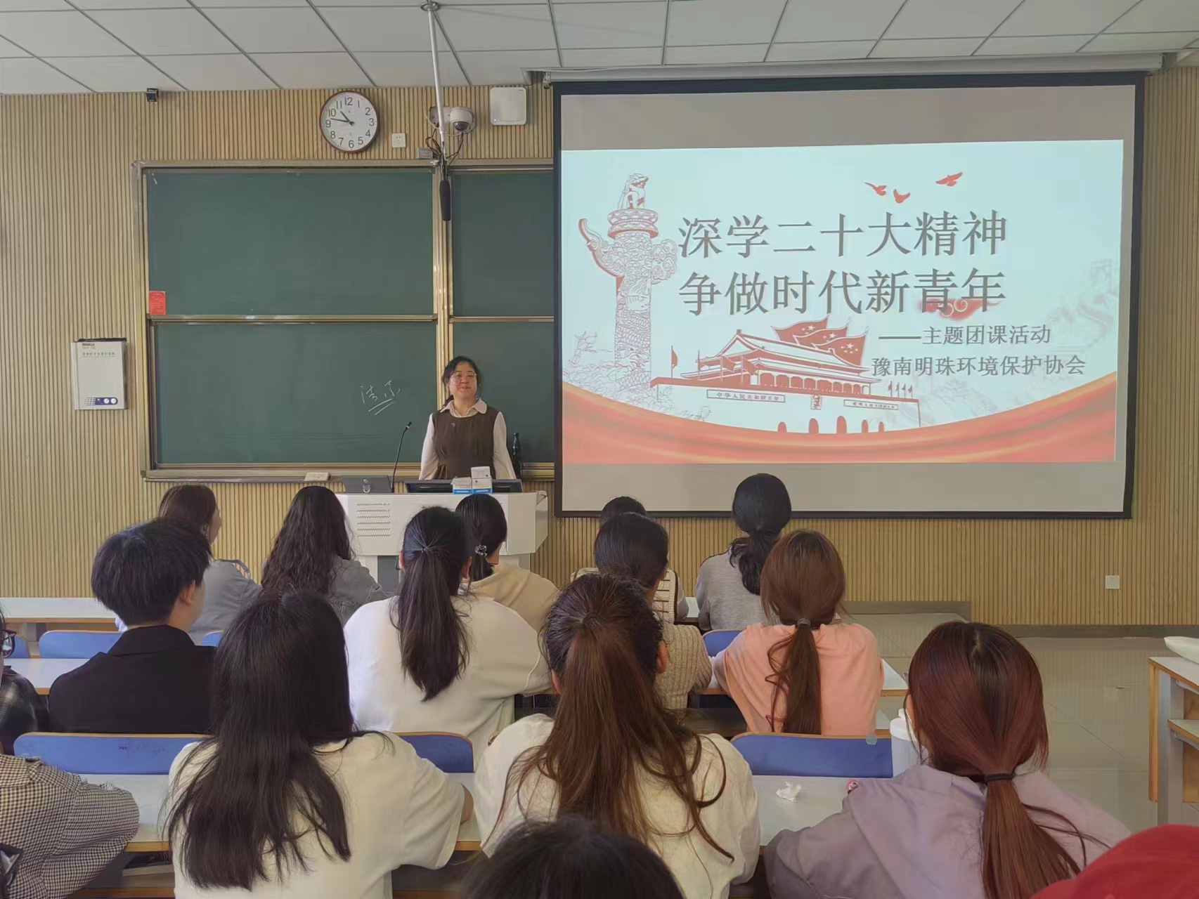 在众人翘首以盼中,中国共产党的第二十次全国人民代表大会如期召开并圆满结束。为深入学习党的二十大、领会全党全会精神、以精神指导青年实践,10月18日,豫南明珠环境保护协会于社科楼515举办“深入学习贯彻党的二十大”主题团课。