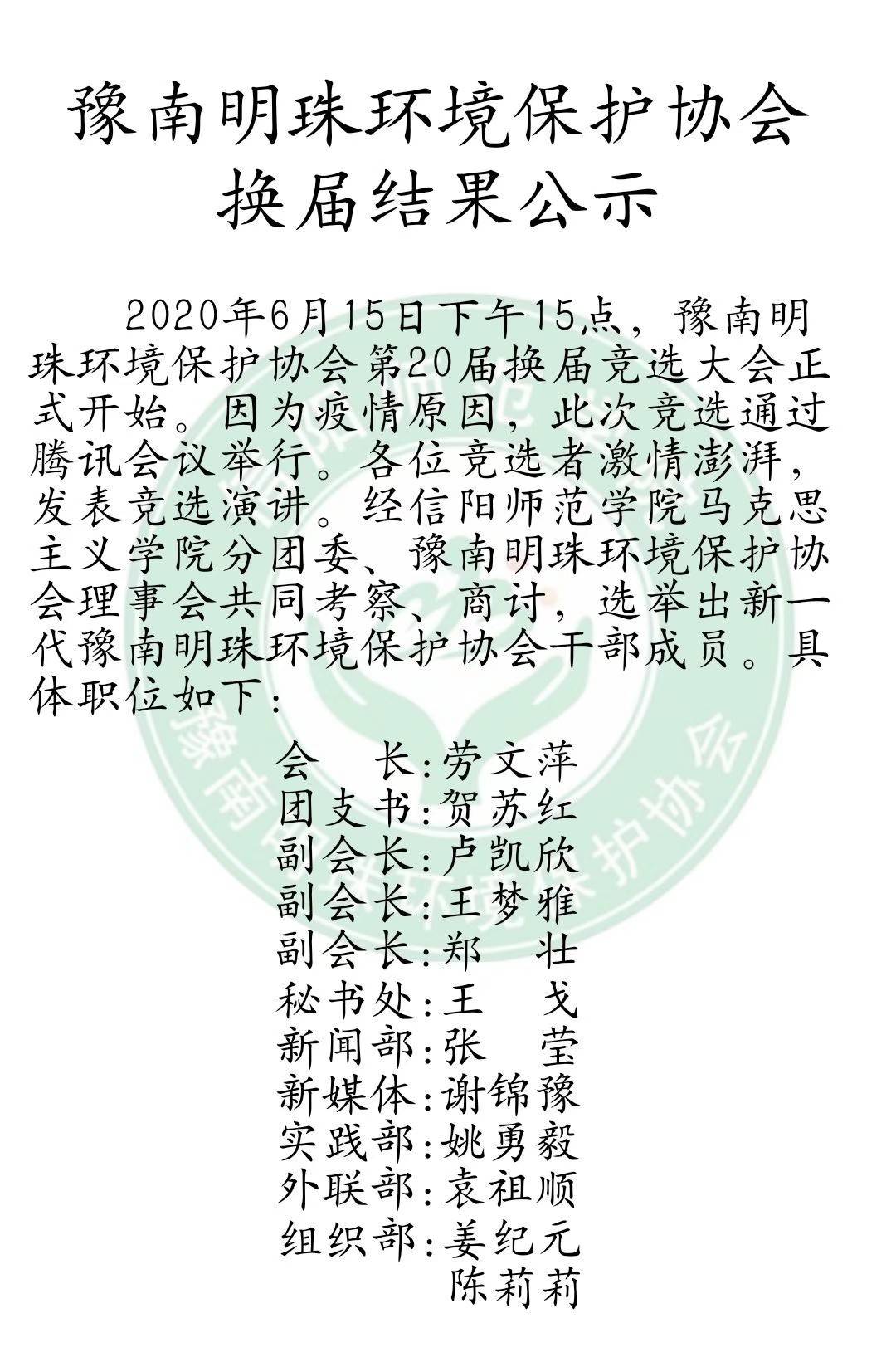 6月15日下午,豫南明珠环境保护协会换届竞选大会在线上会议平台腾讯会议顺利举行。ok138cn太阳集团529分团委社团分管主席、社团会长、团支书、各部部长及19级社团成员共同参加了此次会议。会议由会长吕苗苗主持。