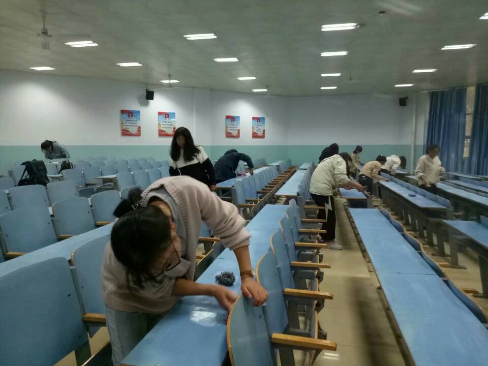 当天下午,参与活动的社员在教九楼集合,集合完毕后,我们按照之前的分组情况进入自己所在小组负责的教室进行打扫。打扫过程中大家都认真对待自己负责的区域,仔细清理桌椅的污渍,耐心清理窗户上的灰尘……经过一个多小时的打扫,我们的教室重新恢复了整洁,桌椅重新恢复了干净。打扫完成后,本次活动的负责人对四个教室打扫情况进行了检查,确认打扫干净后组织大家有序离开教室。