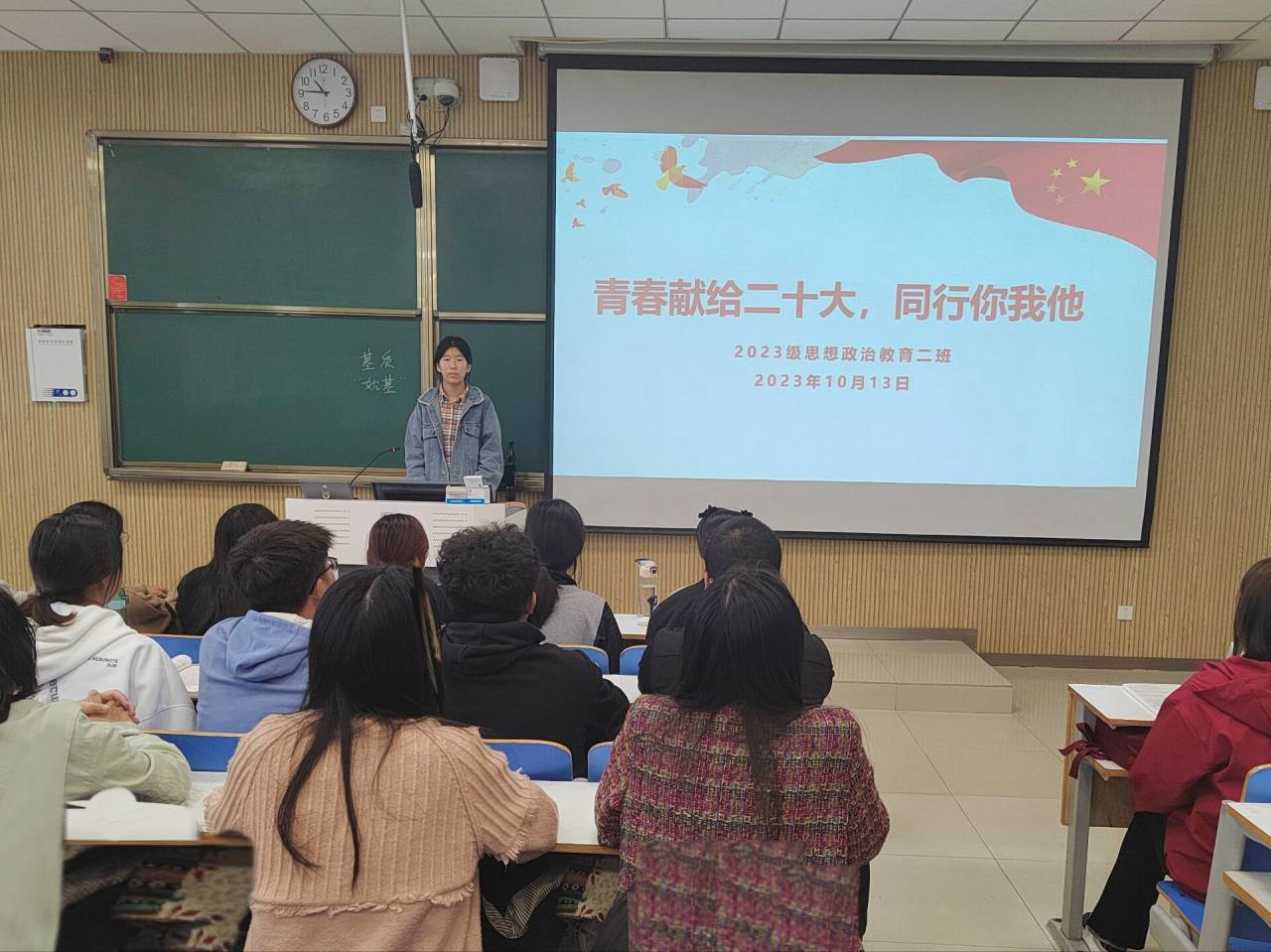 10月13日上午,ok138cn太阳集团5292023级思想政治教育二班在社科楼515教室召开“青春献给二十大,同行你我他”主题团课。我院2023级思想政治教育二班全体同学共同参与本次团课,团课由团支书王慜初主持。
