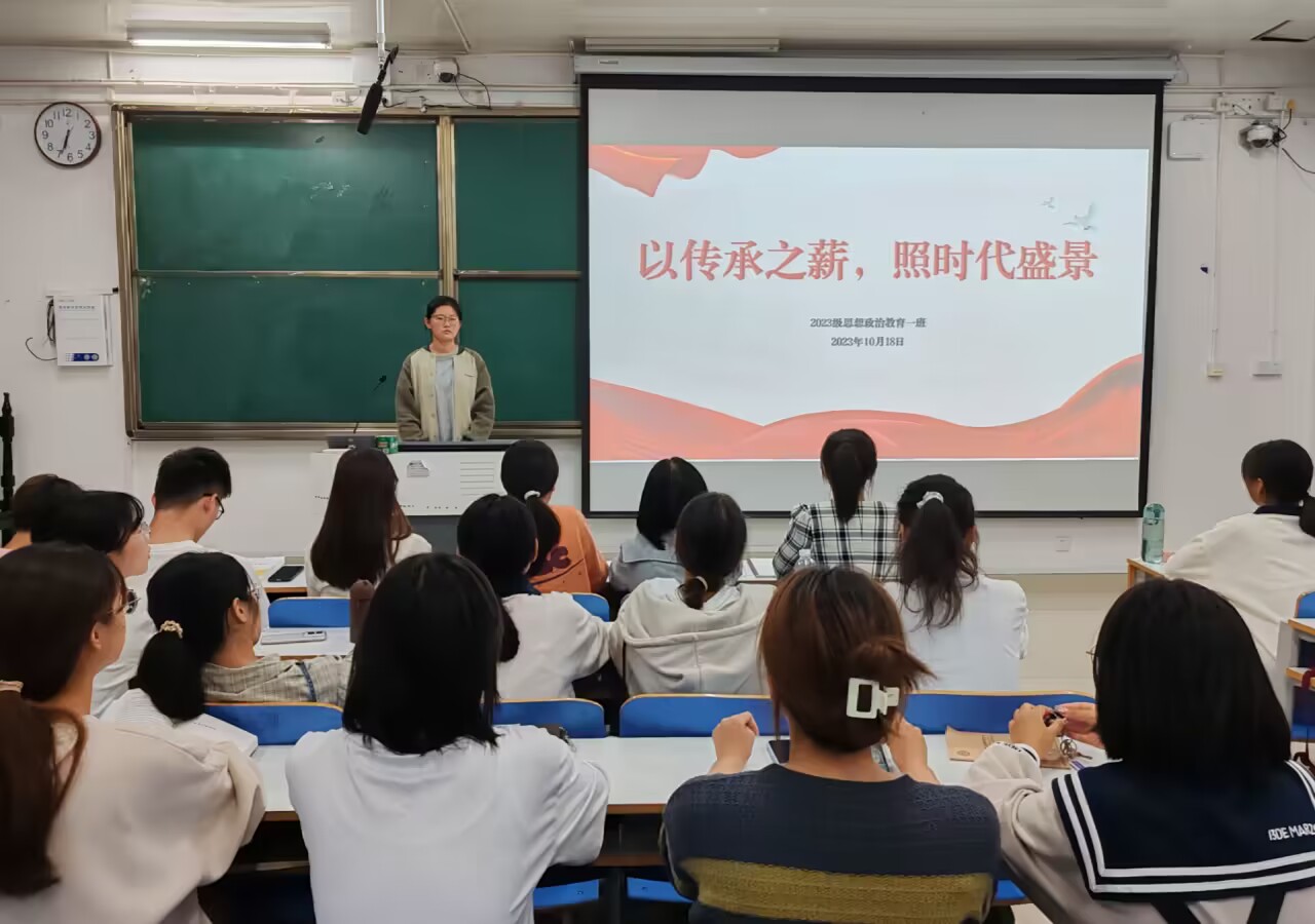 10月16日下午,ok138cn太阳集团5292023级思想政治教育一班在社科楼515教室召开“以传承之薪,照时代盛景”主题团课。我院2023级思想政治教育一班全体同学共同参与本次团课,团课由团支书张卓主持。