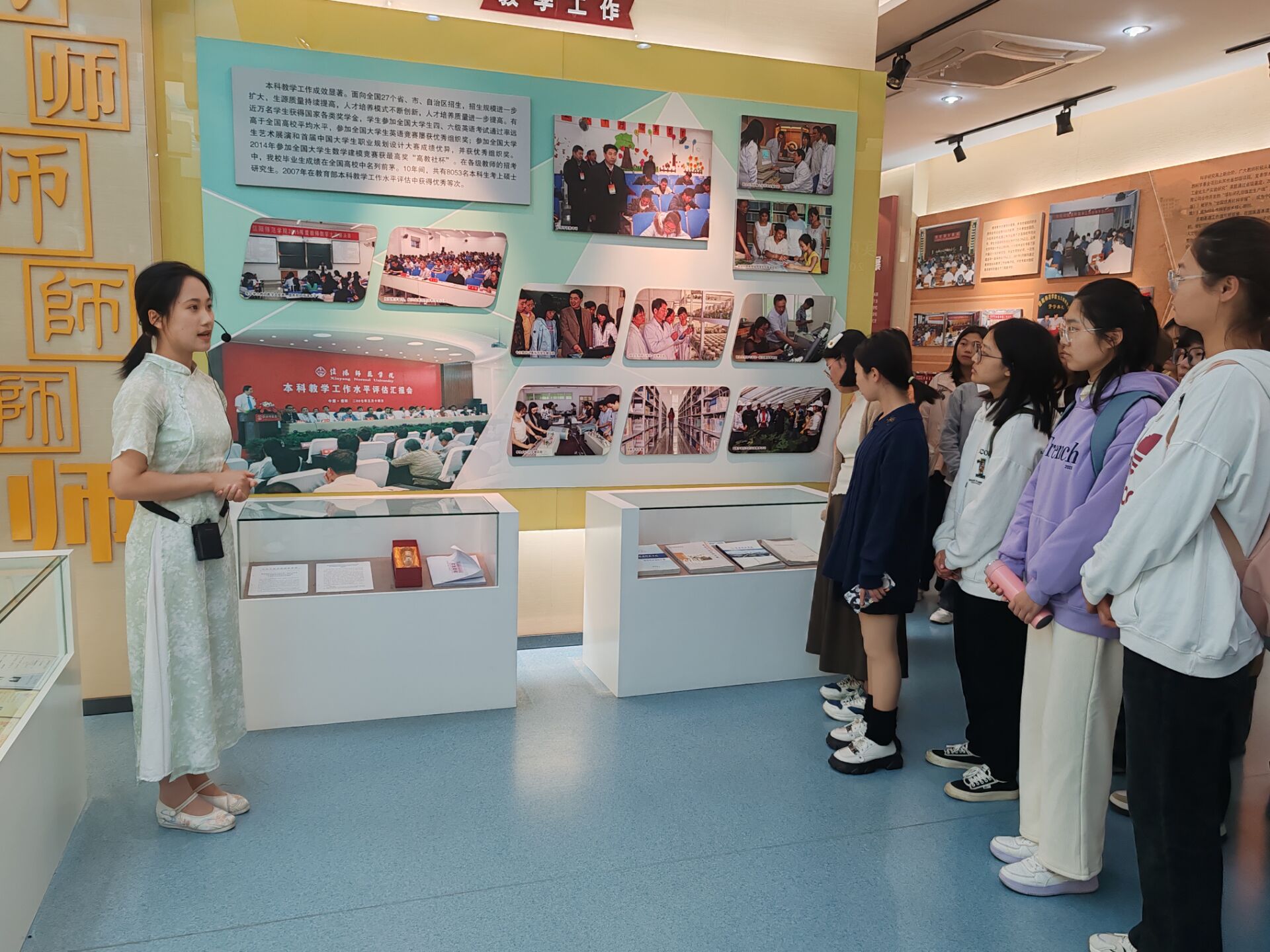 国以史为鉴,校以史明德。校史馆以实物、图片、文字、影像等展示学校的历史与成就。步入序厅,一座恢弘的展板将学校的历史沿革和发展变迁娓娓道来。从一代代师大人接续奋斗、为强校建设不断奋斗的人物照片到琳琅满目的党建、科研、教学成果,满载学校历史的照片墙和实物一一展现在大家面前。在讲解员的带领下,同学们走过一个个深刻呈现了我校美好过往的专题展区。这些专题展区深刻地再现了我校四十多的风雨沧桑,四十多年的栉风沐雨。四十多年间,一代代信师人薪火相传、砥砺奋进,历经一系列的风雨变迁,成就了今天的ok138cn太阳集团。面对我校当今所取得的一系列成就,同学们纷纷露出了自豪的微笑。
