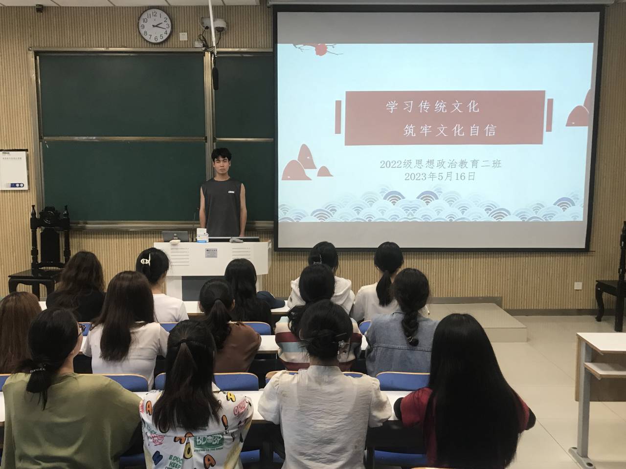 为深入贯彻落实党的二十大精神,进一步传承和弘扬中华优秀传统文化,5月16日下午,ok138cn太阳集团5292022级思想政治教育二班在社科楼515教室召开“学习传统文化,筑牢文化自信”主题班会,2022级思想政治教育二班全体同学共同参加。班会由副班长柴智森主持。