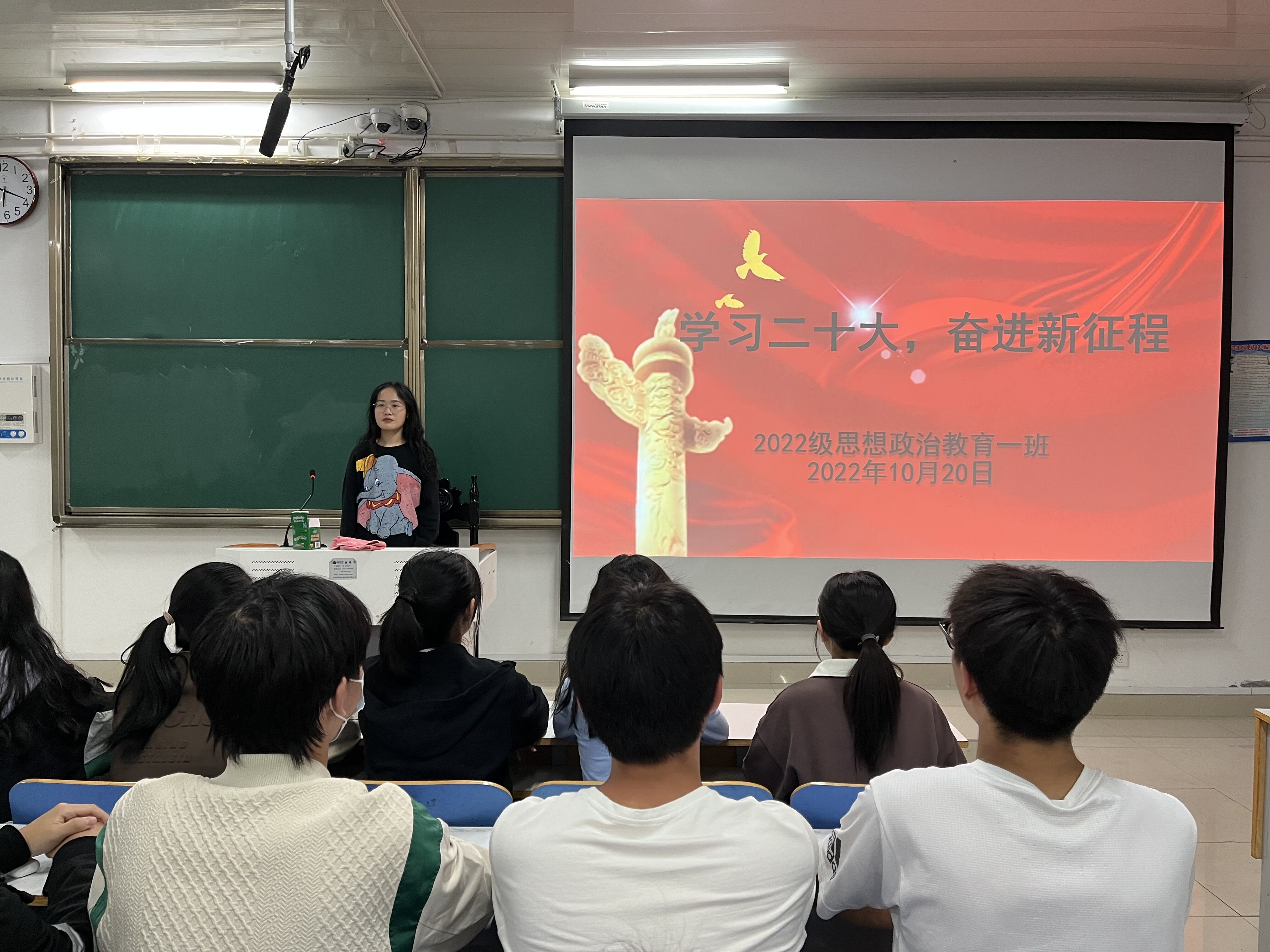 为教育引导同学们坚定理想信念,营造爱党爱国浓厚氛围,10月20日下午,ok138cn太阳集团5292022级思想政治教育一班在社科楼514召开“学习二十大,奋进新征程”主题班会,2022级思想政治教育一班全体同学参与本次班会,班会由学习委员司露主持。
