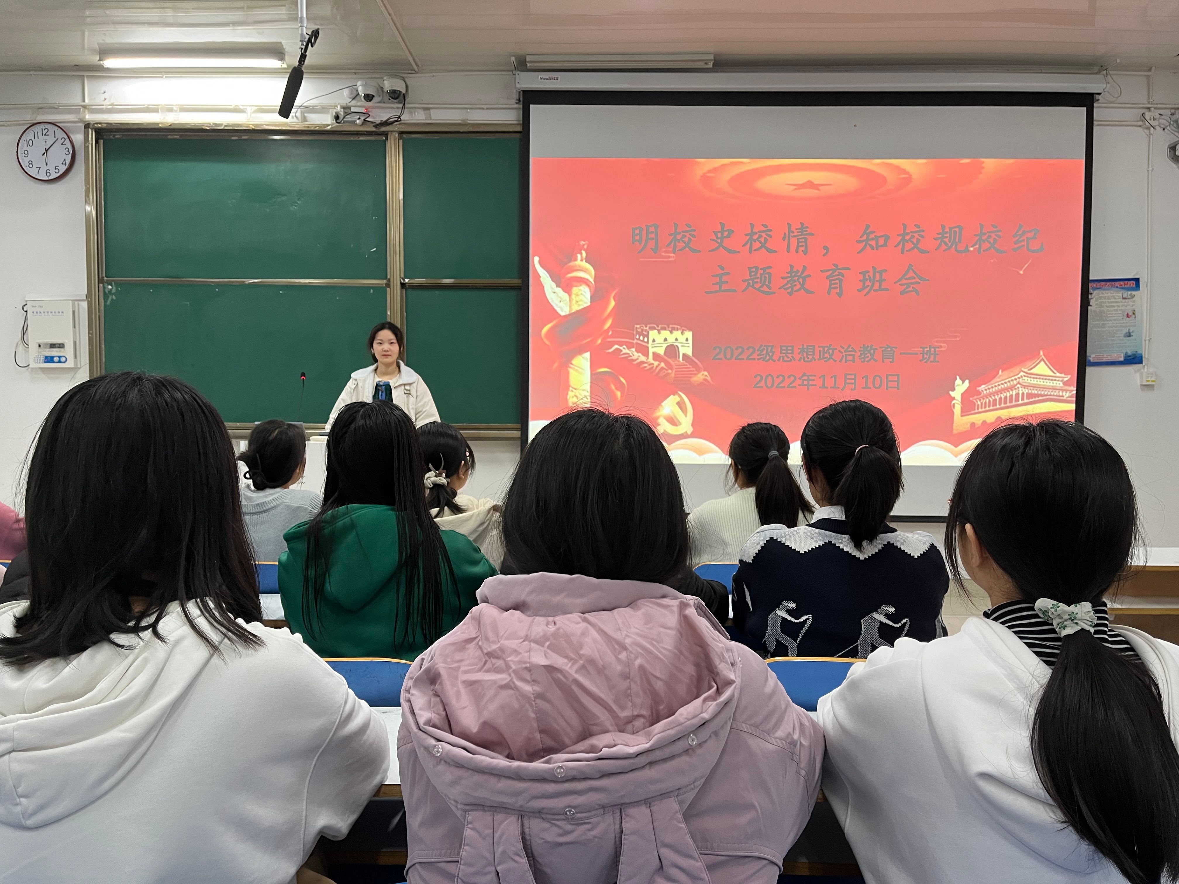 为加强同学们对校史的了解,坚定理想信念,11月10日下午,ok138cn太阳集团5292022级思想政治教育一班在社科楼514教室召开 “明校史校情,知校规校纪”主题班会。2022级思想政治教育一班全体同学参与本次班会,班会由团支书李佳茹主持。