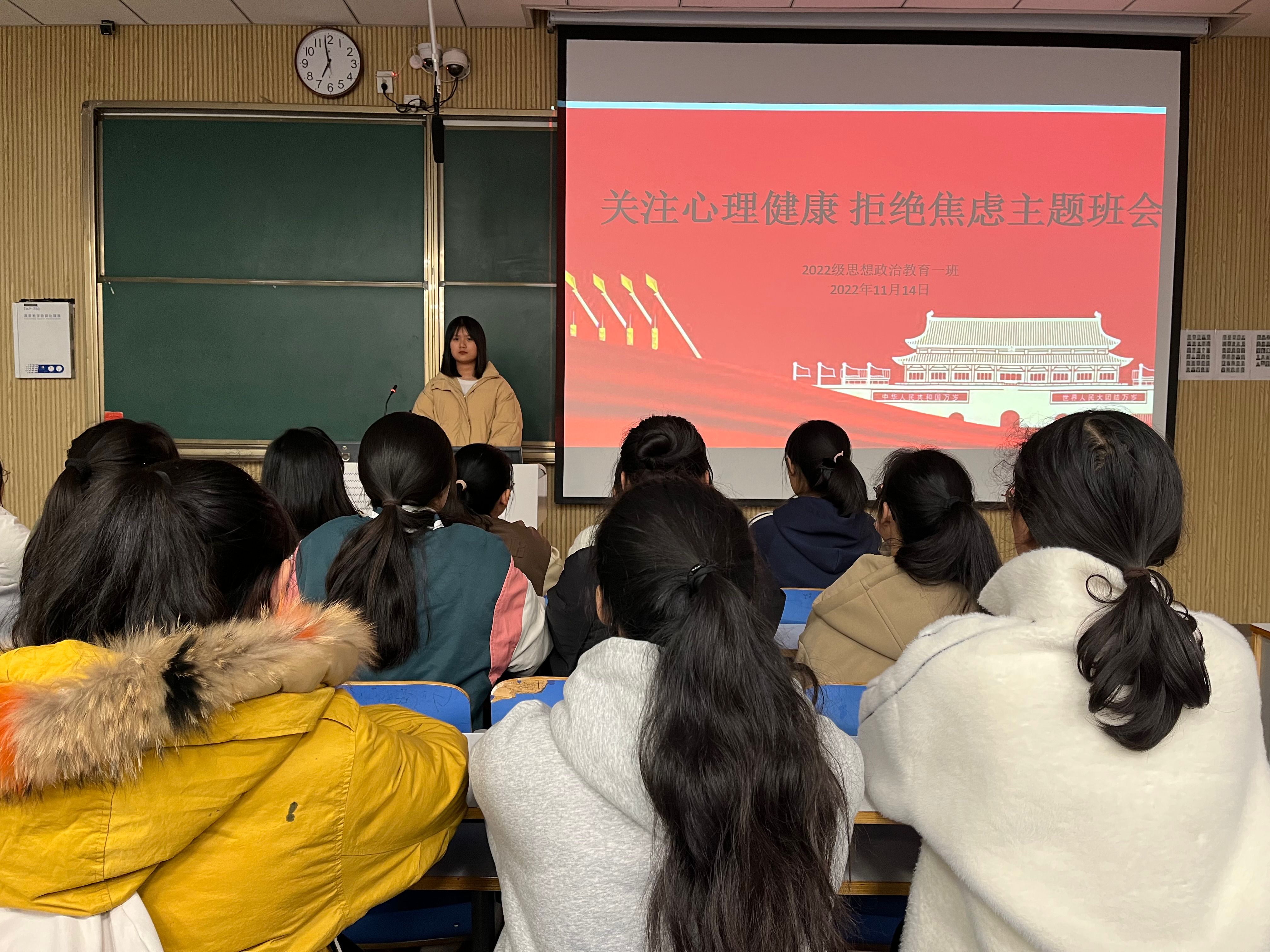 为加强心理健康教育,提高同学们心理健康素质,11月14日下午,ok138cn太阳集团5292022级思想政治教育一班在社科楼515教室召开“关注心理健康,拒绝焦虑”主题班会。2022级思想政治教育一班全体同学参与本次班会,班会由心理委员马思源主持。