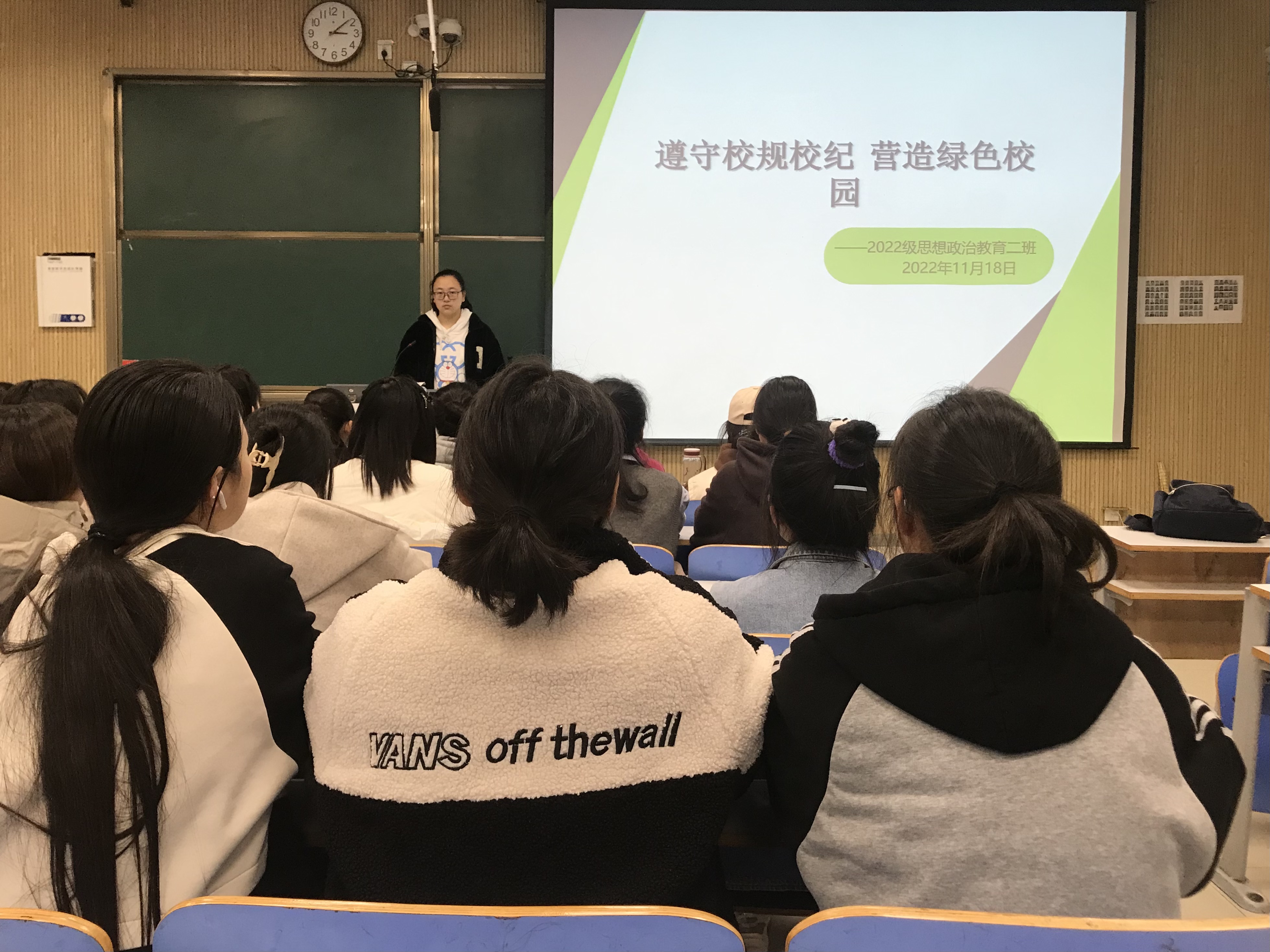 11月18日下午,ok138cn太阳集团5292022级思想政治教育二班在社科楼515教室召开“遵守校规校纪 营造绿色校园”主题班会。2022级思想政治教育二班全体同学共同参加会议。本次会议由班长李佳音主持。