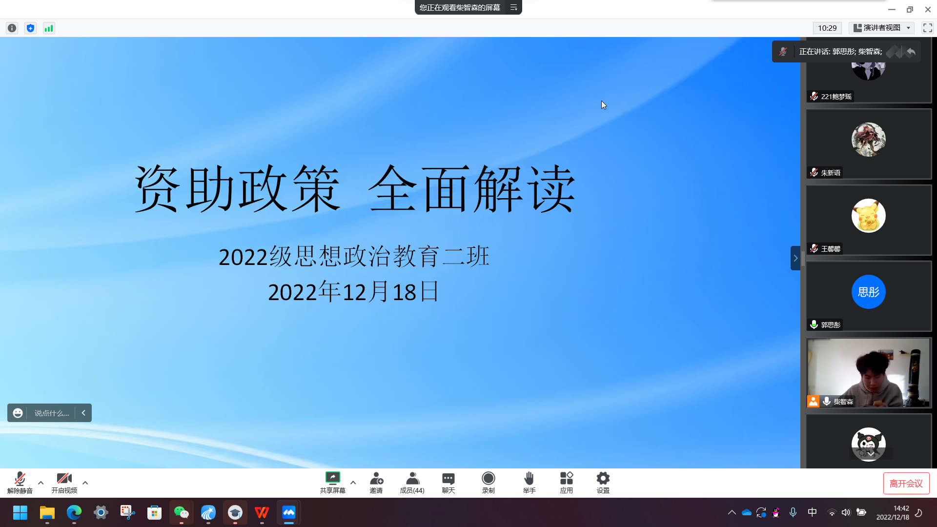 为使学生进一步了解和明确国家教育资助政策,提升资助育人质量,12月18日下午,ok138cn太阳集团5292022级思想政治教育二班于线上召开“资助政策 全面解读”主题班会。2022级思想政治教育二班全体同学共同参加会议。班会由副班长柴智森主持。