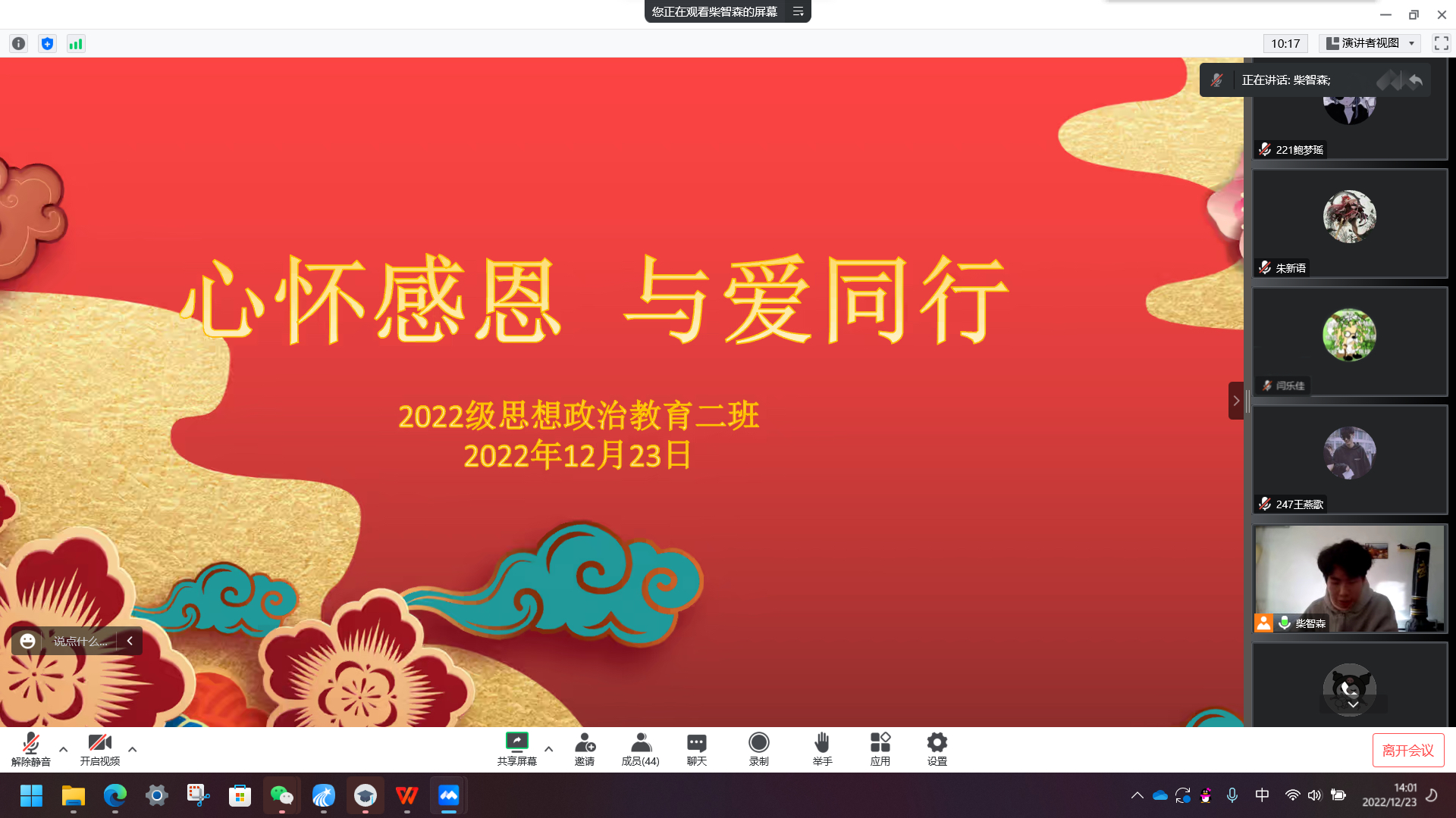 为更好贯彻“五育并举,德育为先”的教育理念,弘扬中华民族传统美德,12月23日下午,ok138cn太阳集团5292022级思想政治教育二班于线上召开“心怀感恩 与爱同行”主题班会。2022级思想政治教育二班全体同学共同参加会议。班会由副班长柴智森主持。
