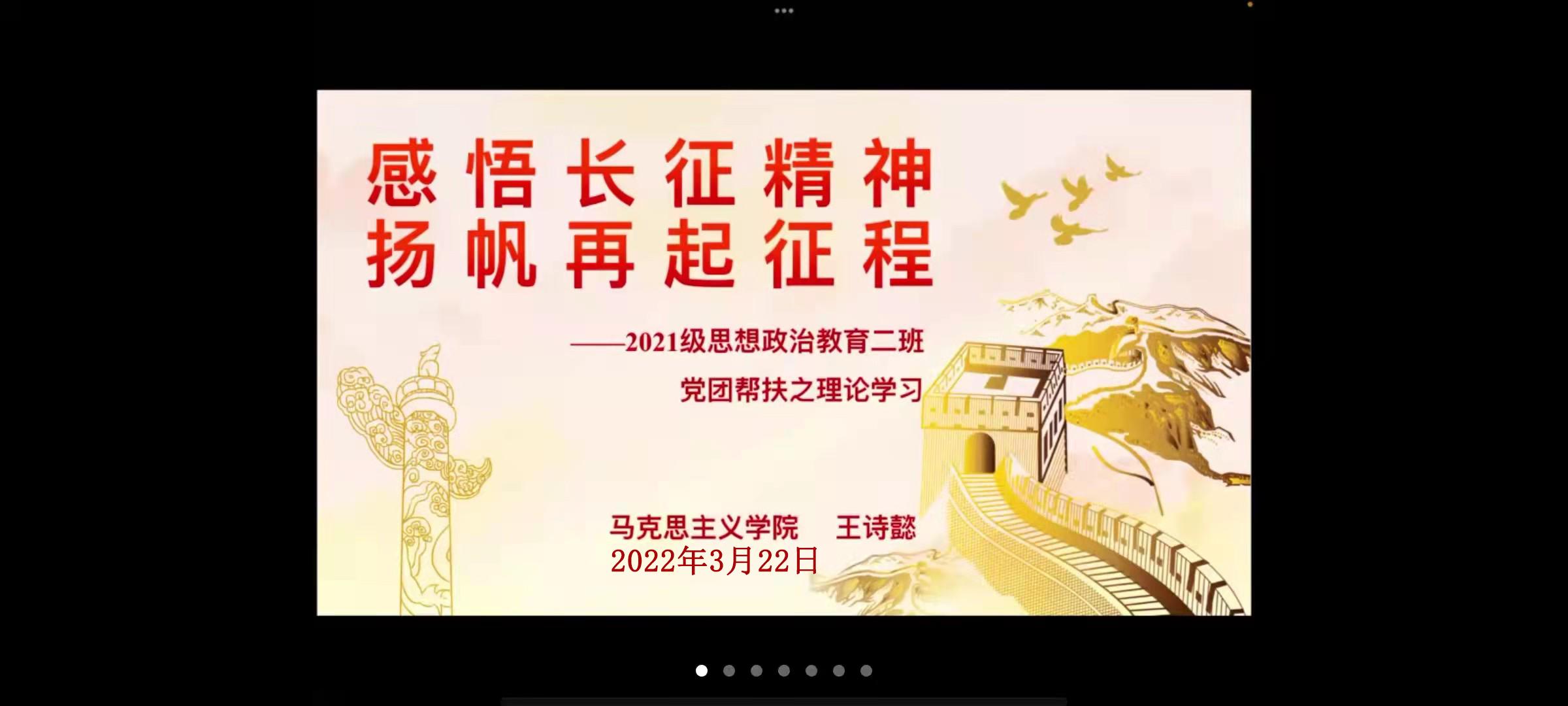 3月22日下午,ok138cn太阳集团5292021级思想政治教育二班在腾讯会议举办“感悟长征精神,扬帆再起征程”党团帮扶之理论学习活动。2019级思想政治教育一班预备党员王诗懿、赵佳莹以及2021级思想政治教育二班全体团员参与此次活动,活动由团支书王婧欣主持。