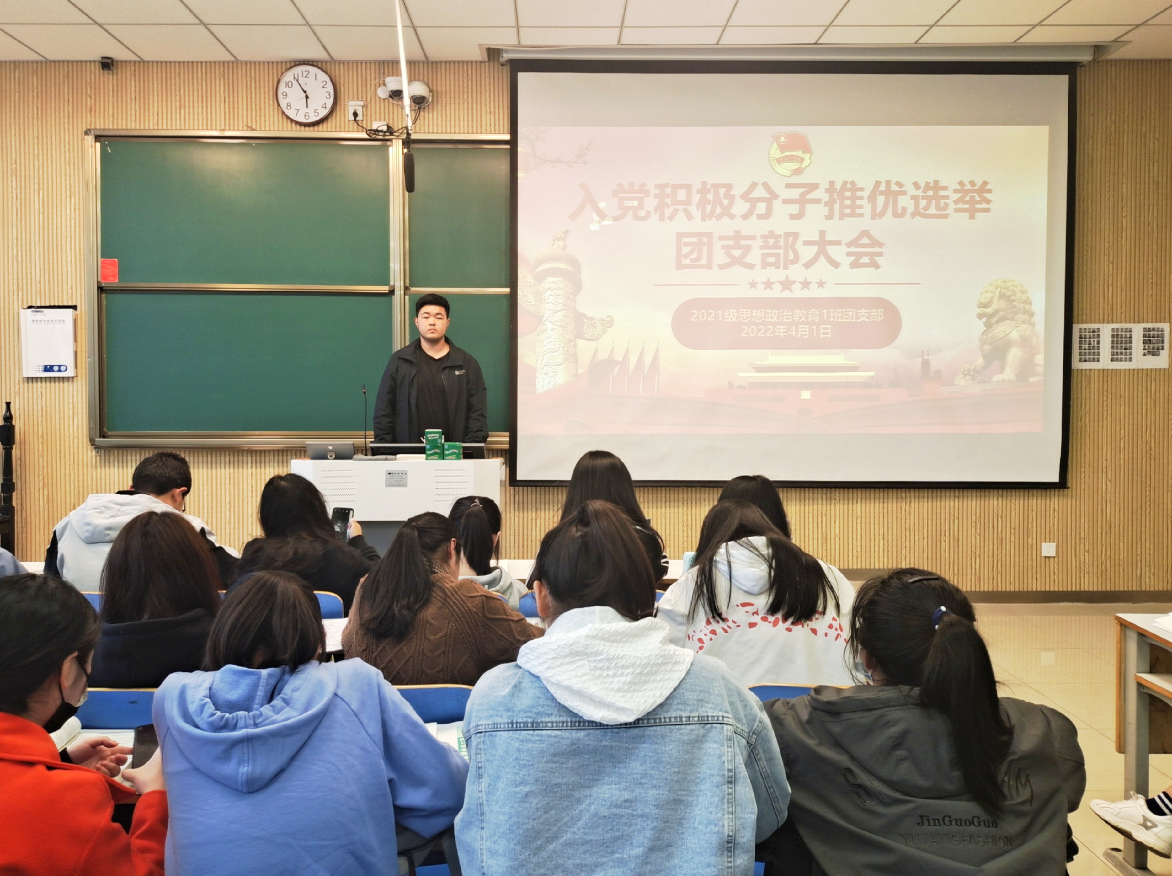 4月1日下午,ok138cn太阳集团5292021级思想政治教育一班在社科楼515召开入党积极分子推优选举团支部大会。2021级思想政治教育一班全体团员共同参加了本次团支部大会。团支部大会由团支书戴翰林主持。