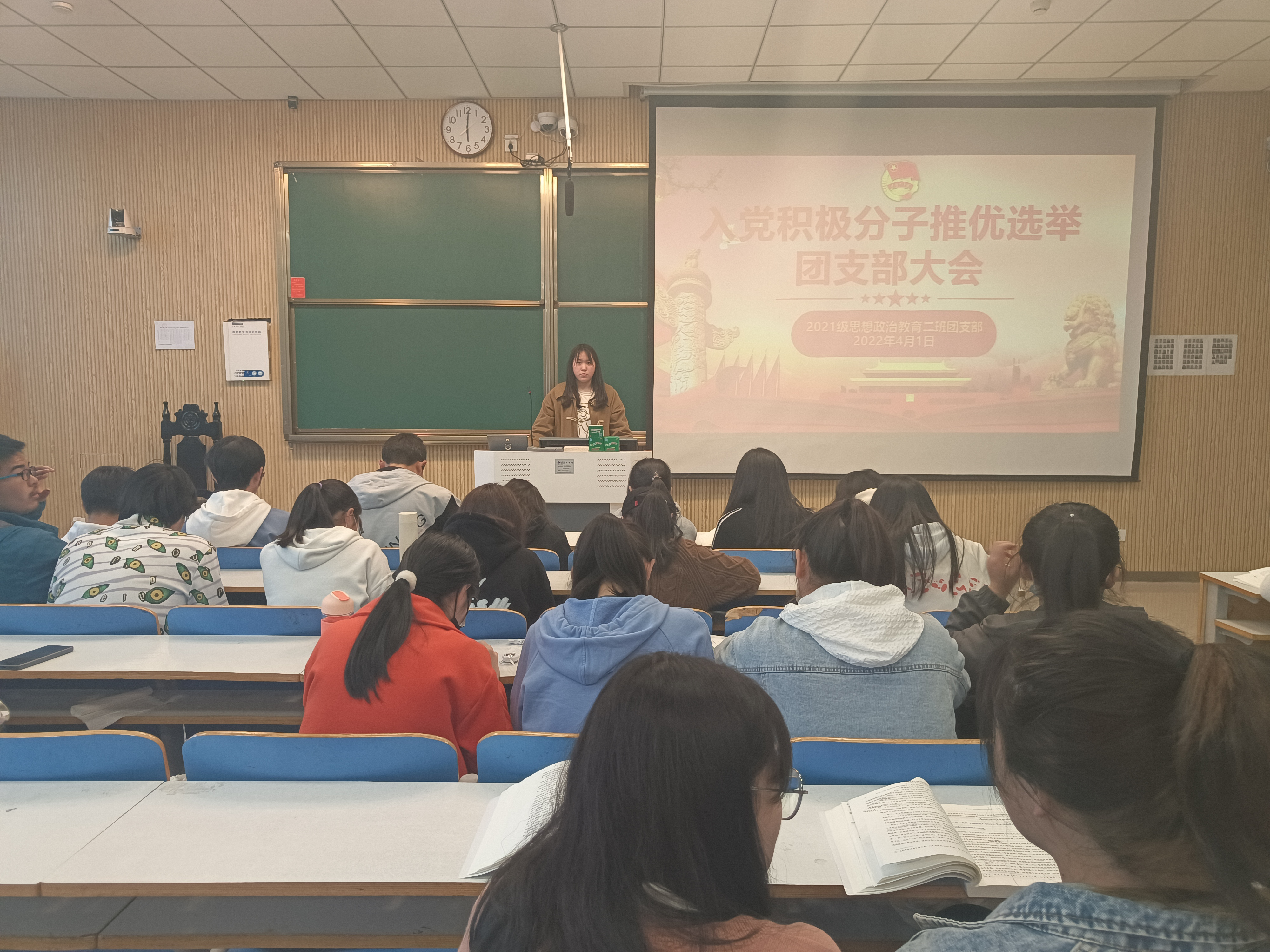 4月1日下午,ok138cn太阳集团5292021级思想政治教育二班在社科楼515教室召开入党积极分子推优选举团支部大会。2021级思想政治教育二班全体团员参与此次团支部大会,团支部大会由团支书王婧欣主持。