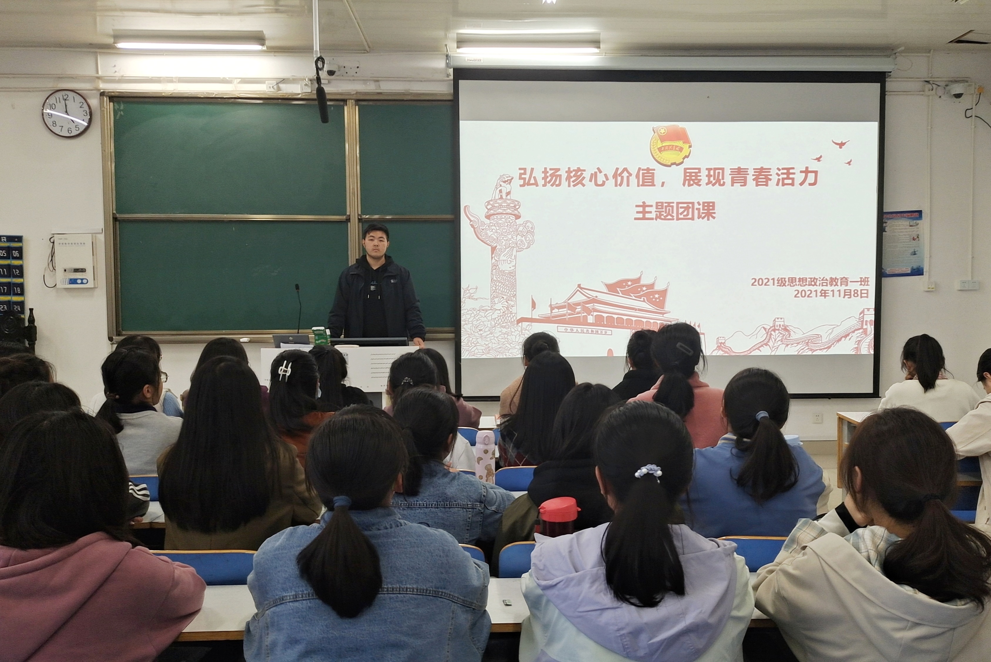 为深入学习贯彻习近平新时代中国特色社会主义思想,引导全体团员牢固树立四个意识,坚定四个自信,11月8日下午,ok138cn太阳集团5292021级思想政治教育一班在社科楼516教室召开“弘扬核心价值观,展现青春活力”主题团课。2021级思想政治教育一班全体团员参加本次团课。团课由团支书戴翰林主持。