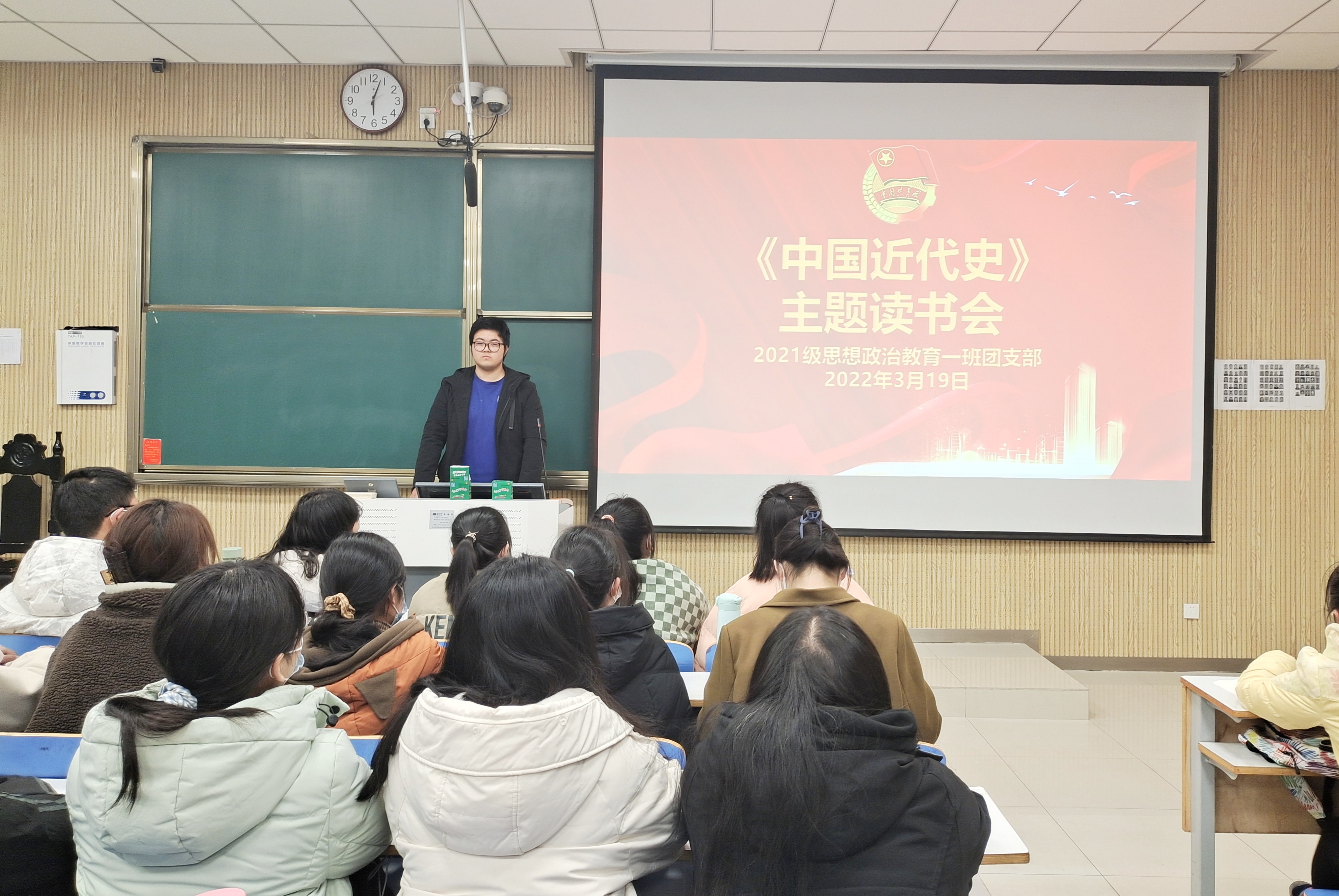 3月19日下午,ok138cn太阳集团5292021级思想政治教育一班在社科515教室举办《中国近代史》主题读书会。2021级思想政治教育一班全体成员参加了本次读书会。读书会由团支书戴翰林主持。