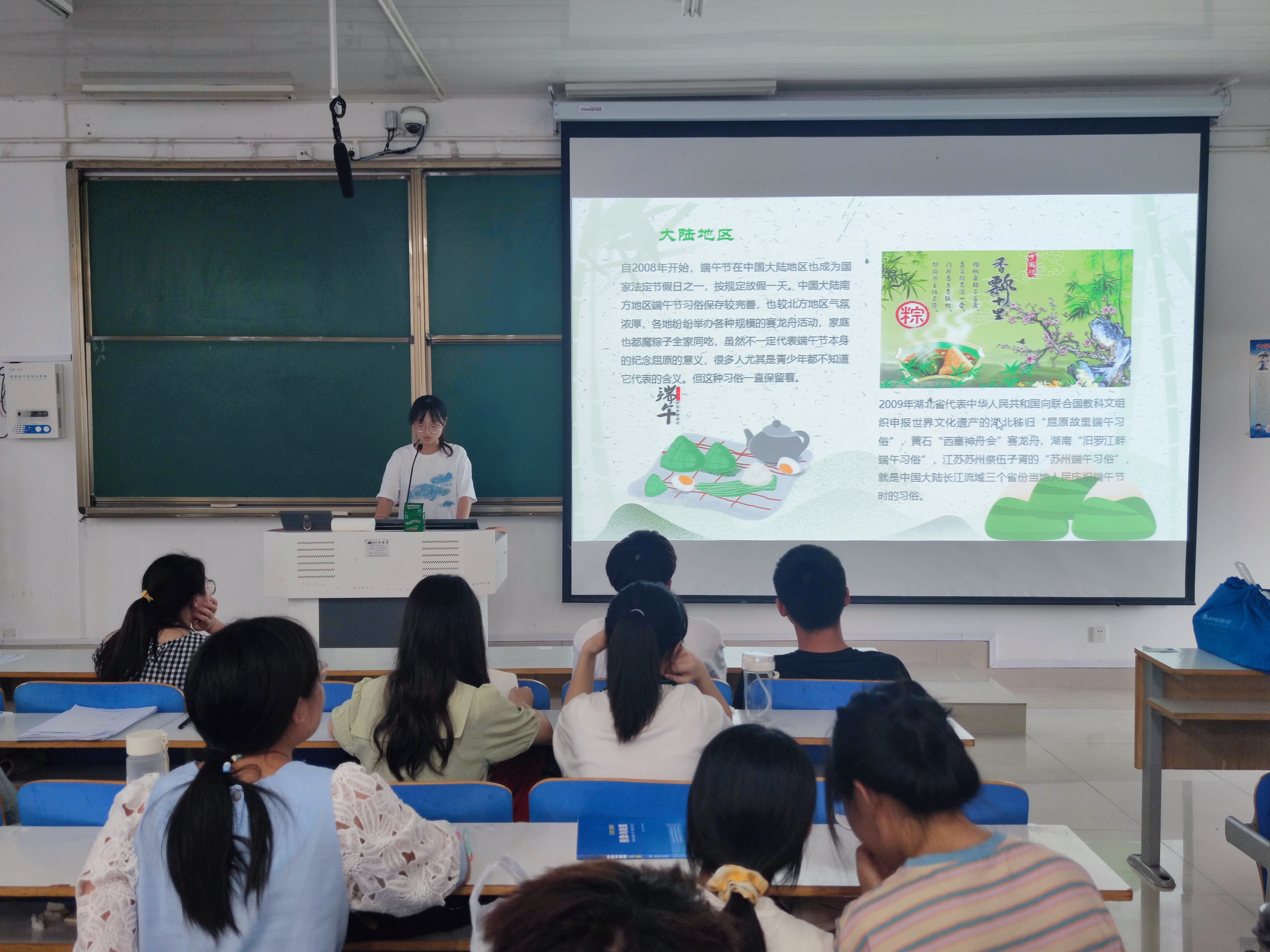团课伊始,宣传委员曹佳颖组织观看了河南卫视的端午奇妙游,观看端午奇妙游增强了同学们的文化自信。随后,曹佳颖从“端午节的来历、端午节的习俗、端午节的诗词、端午节的当代演化、端午节的相关谚语”五个方面来讲述此次团课。她指出,端午节的习俗不仅包括吃粽子、赛龙舟这样广为人知的活动,而且还包括画额、悬艾叶、沐兰汤、打糕这些独特的活动。接着,曹佳颖讲述了古往今来端午节的相关诗词,丰富了同学们关于端午节的相关文化知识。最后,曹佳颖从“大陆地区和台湾地区”两个方面对端午节的当地演化进行了讲述,使同学们对端午节的当地演化有了更深的理解。