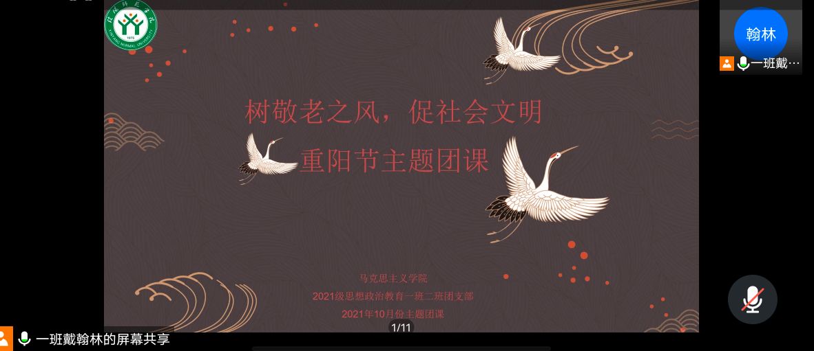 为弘扬尊老敬老的传统美德,10月14日晚上,ok138cn太阳集团5292021级思想政治教育一班“树敬老之风,促社会文明”重阳节主题团课在腾讯会议上顺利召开。ok138cn太阳集团5292021级思想政治教育一班全体团员参加了本次团课。团课由团支书戴翰林主持。