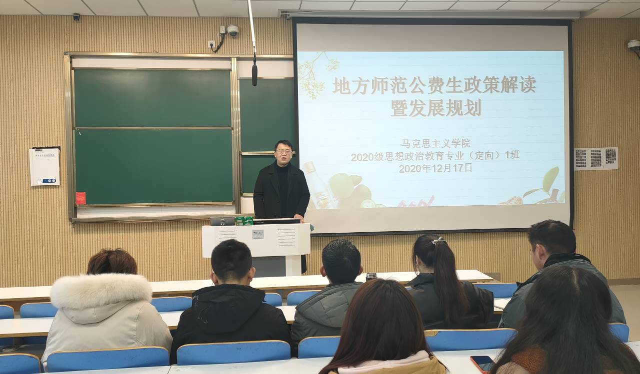 首先,曹栋向同学们解释了地方公费师范生的概念。“农村学校”地方公费师范生培养计划,主要补充农村学校薄弱学科和紧缺学科师资,逐步完善农村学校教师补充体系。接着,曹栋围绕发展过程、培养分类、优惠政策和发展规划四个方面,依次向同学们阐释了公费师范生的具体内容和意义。接着,曹栋提出了公费师范生如何进行职业发展规划的问题,他强调,同学们应当制定学习计划、培养师范技能、提升专业素养和综合能力,立志成为一名优秀思政课教师。最后,同学们踊跃提问,曹栋针对同学们有关地方公费师范生的疑惑进行了解答。