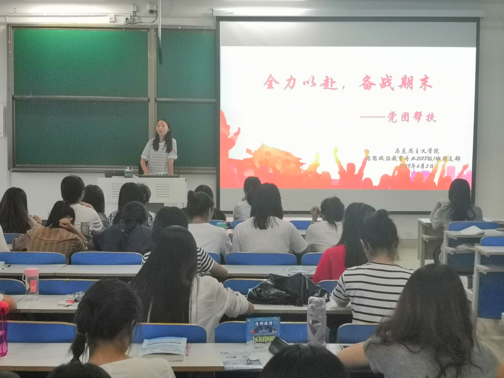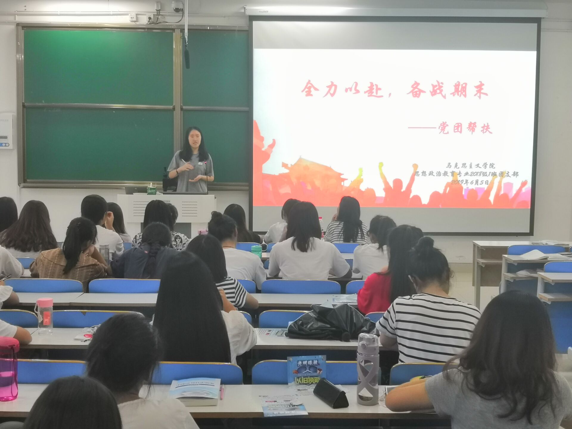 为充分发挥党员干部的先锋模范作用,帮助同学们解决学习和生活问题,6月5日下午,ok138cn太阳集团5292018级思想政治教育一班在社科楼516教室顺利开展“党团帮扶”班会。2018级思政一班全体同学共同参加此次会议。会议由团支书靳雨露主持。