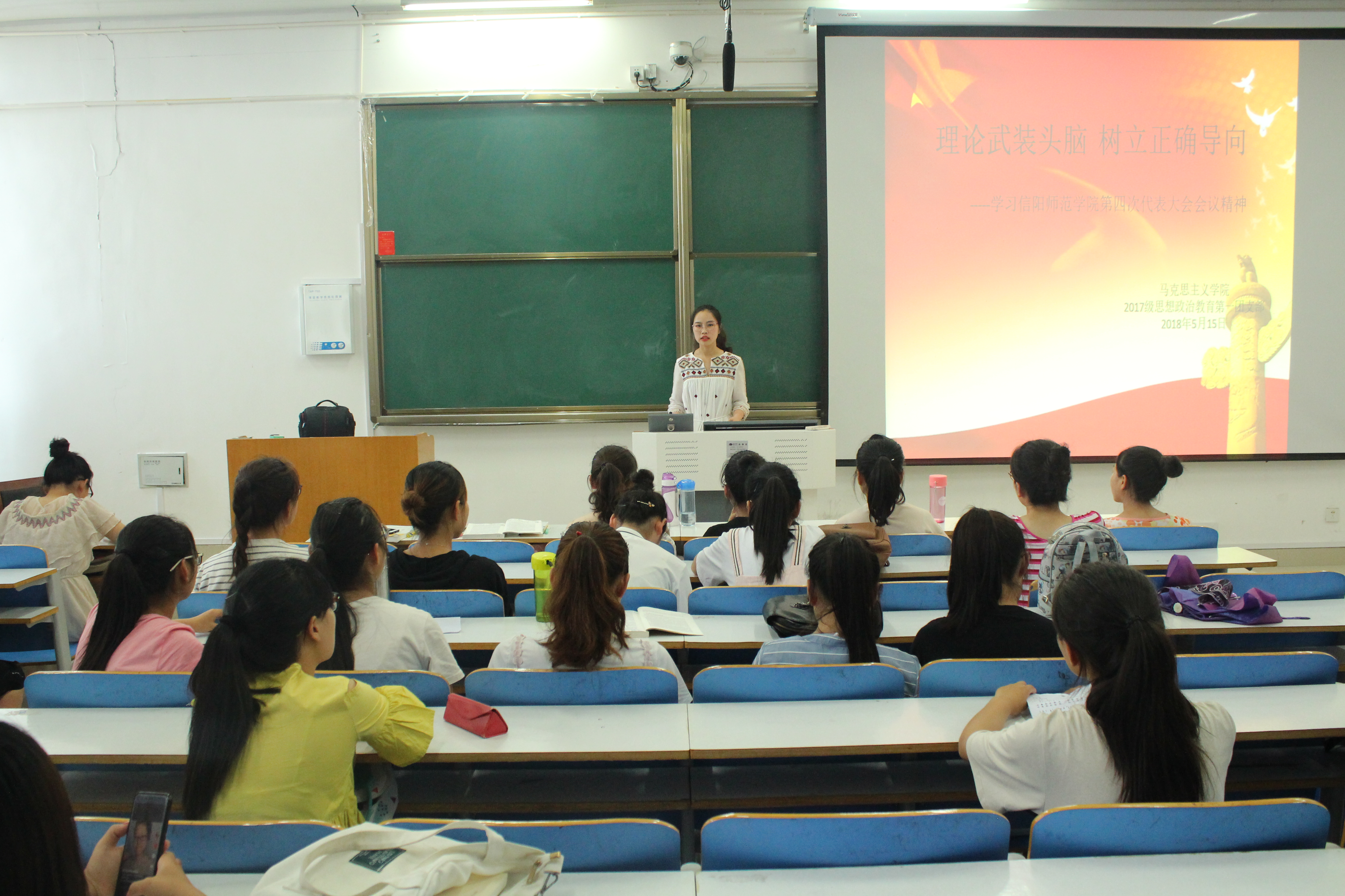 为深入推动我班学子学习信阳师范学院第四次党代会会议精神,高举中国特色社会主义伟大旗帜,深入贯彻落实党的十九大精神,全面贯彻党的教育方针,5月17日上午,2017级思想政治教育一班全体学生在社科楼515教室举行“理论武装头脑,树立正确导向。”主题活动。活动由团支书谢文静主持。