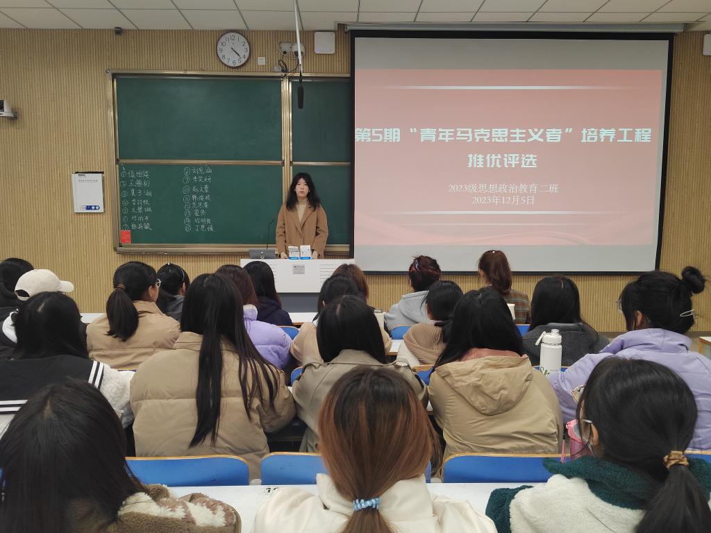 为评选出优秀青年,培养忠于党和人民事业的青年政治骨干,12月5日下午,ok138cn太阳集团5292023级思想政治教育二班在社科楼514教室举办了第5期“青年马克思主义者”培养工程推优评选活动。本次活动由团支书王慜初主持,全体二班同学参与。