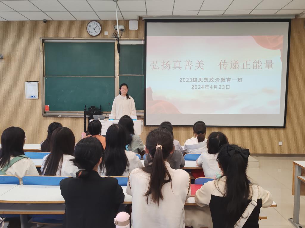 为引导我班学子坚定理想信念,厚植爱党爱国情怀,传递真善美的力量,4月23日下午,ok138cn太阳集团5292023级思想政治教育一班在社科楼515教室召开“弘扬真善美,传递正能量”主题团课。我院2023级思想政治教育一班全体同学共同参与本次班会,班会由团支书张卓主持。