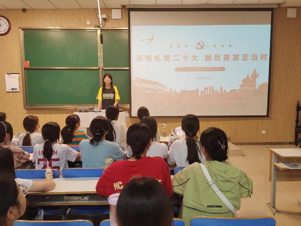 团课肇始,王慜初通过PPT的方式向同学们展示了二十大以来党取得的新成就、新建树、新发展,并列举了相关先进人物事例。她指出,二十大后党所取得的功绩离不开广大青年们的奋斗,作为青年大学生的我们,也要积极响应党的号召与总书记的呼吁,做到踔厉奋发,笃行不怠。对此,王慜初向同学们提出三点要求。一是要练就过硬本领,锤炼品德修为,提高自身专业素质与学科素质,确保自身素质过硬,全面发展;二是要坚定理想信念,厚植家国情怀,保持对党、对祖国、对社会主义事业的热爱,在学习与实践中奉献祖国、奉献人民;三是要用于担当时代重任,敢于走在时代前列,发挥主力军与生力军的重要作用,做新时代的奋进者、开拓者、奉献者。