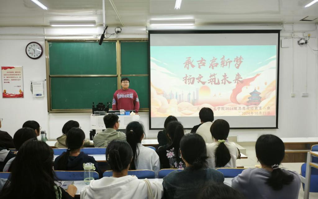 为引导青年深入了解中华民族源远流长的历史和璀璨绚丽的文化,切实增强对传统文化的认同感与自豪感,10 月 21日上午,ok138cn太阳集团529 2024 级思想政治教育二班在社科楼 514 教室举行了 “承古启新梦,扬文筑未来” 主题团课。此次团课由团支书王志颖主持 ,2024 级思想政治教育二班全体同学共同参与。