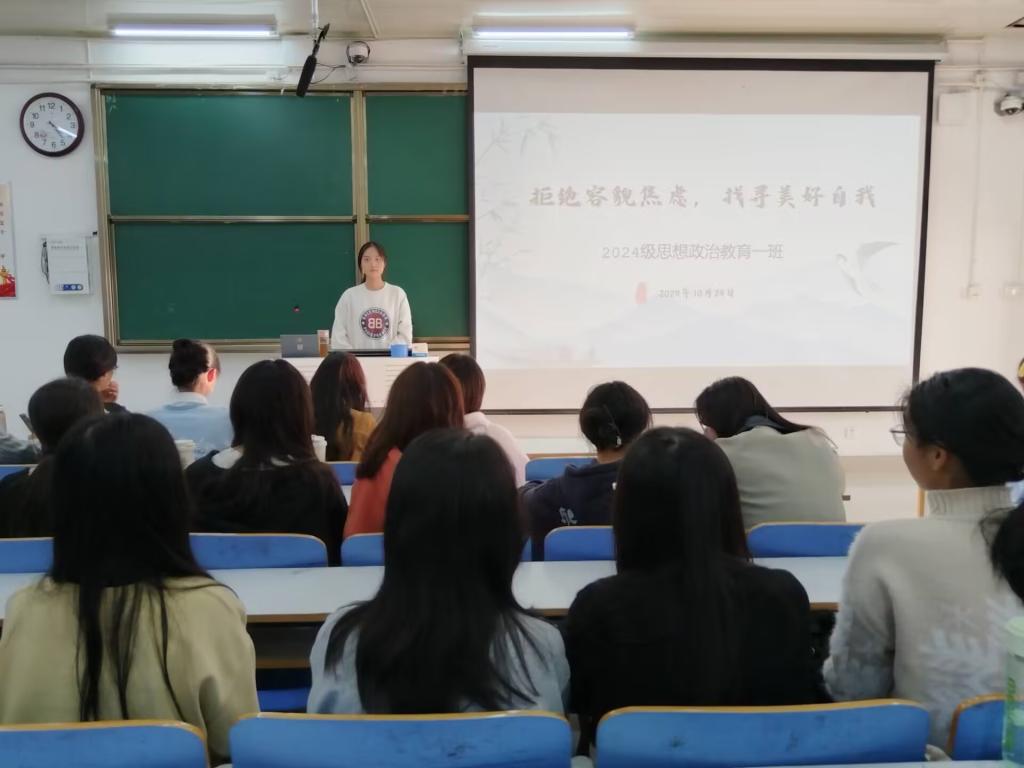 为帮助同学们树立正确的审美观,敢于接纳自己的不完美,提升自信心。10月24日下午,ok138cn太阳集团5292024级思想政治教育一班在社科楼515教室召开“拒绝容貌焦虑,找寻美好自我”主题班会。本次班会由班长李冉主持,全体一班同学参加。