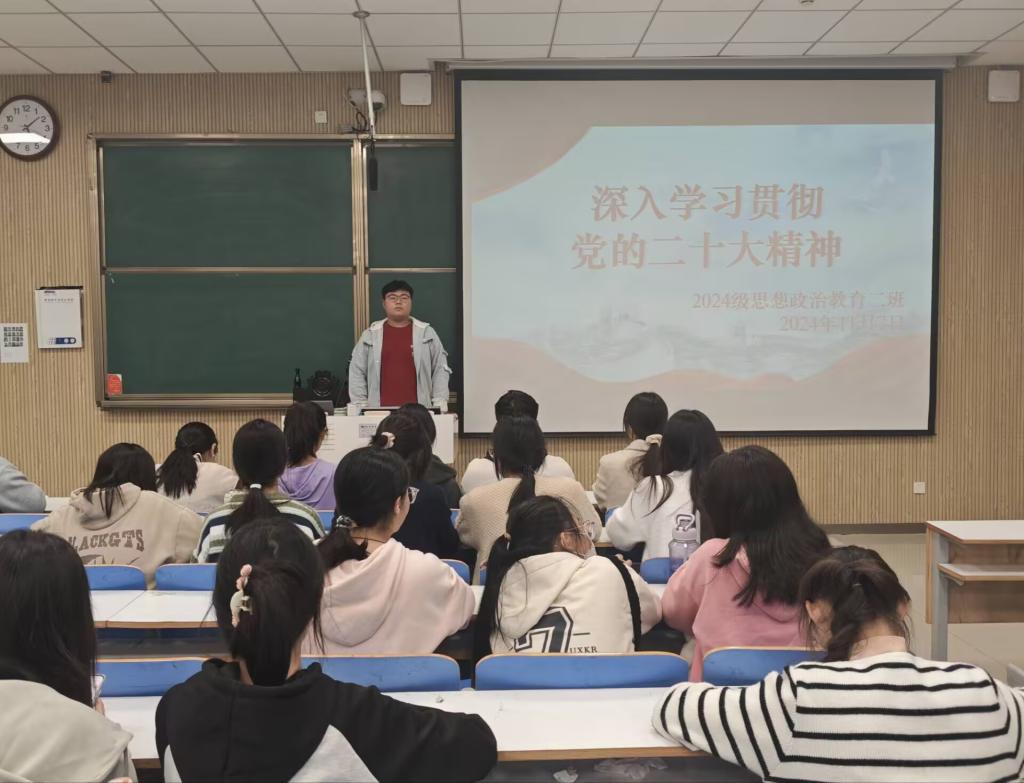 为让青年深刻领会党的二十大精神实质和丰富内涵,增强对党的路线方针政策的理解和认同,提高政治觉悟和政治能力,11月7日下午,ok138cn太阳集团529 2024 级思想政治教育二班于社科楼515教室举办了 “深入学习贯彻党的二十大精神”主题团课活动。此次团课由团支书王志颖主持,二班全体同学共同参与。