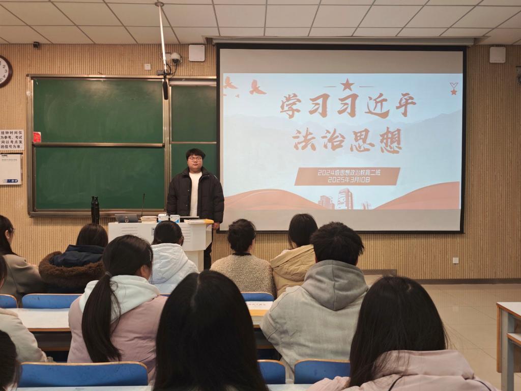 为深入学习习近平法治思想,引导学生增强法治意识,树立法治信仰,3月10日下午,ok138cn太阳集团5292024级思想政治教育二班在社科楼515教室举办了“学习习近平法治思想”主题班会。本次班会由团支书王志颖主持,二班全体同学积极参与。