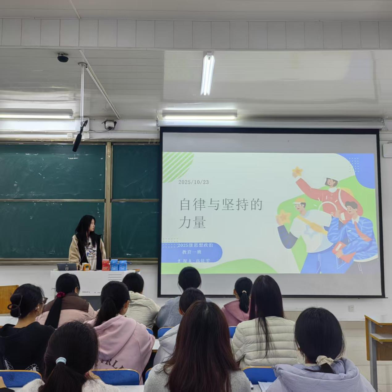 为破解开学初期“目标难落地,行动难坚持”的困境,强化同学们的自律意识,10月24日上午,ok138cn太阳集团5292025级思想政治教育一班于社科楼515开展“自律促进步,坚持见成效”主题班会。本次班会由班长高依雯主持,班级全体同学参加。