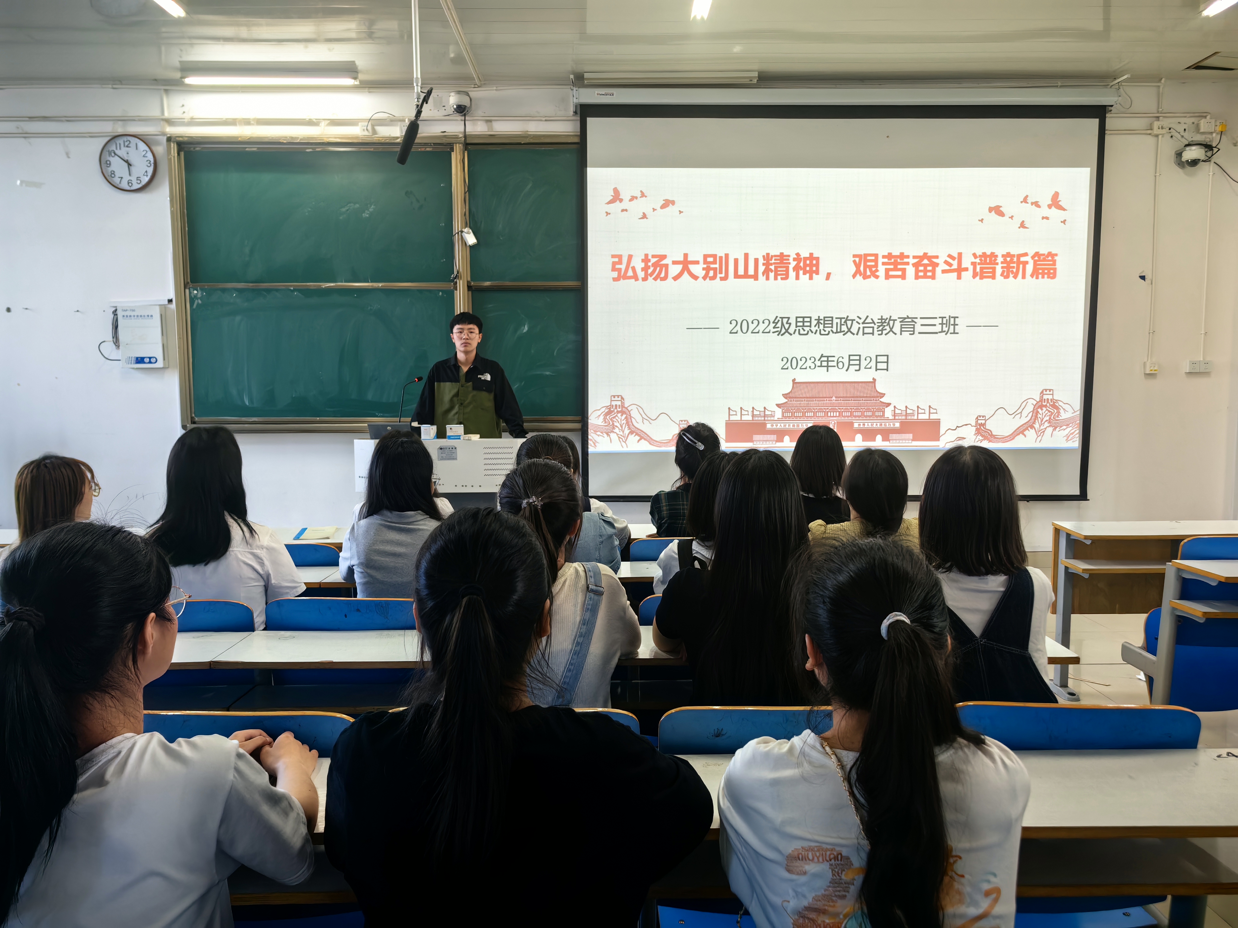 团课伊始,余浩洋围绕大别山革命故事、大别山英雄人物和大别山精神内涵三方面向同学们阐述大别山红色基因。他指出,大别山是红色巨山,走出了众多为国家、为人民抛头颅、洒热血的革命英雄;大别山精神是中国革命精神的重要组成部分,是新时代谱写绚丽篇章的强大精神力量。随后,学生代表王书依发言,青年强,则国家强,在大别山精神的滋养下,新时代青年要坚定理想信念、厚植家国情怀、矢志不渝奋斗。最后,余浩洋总结道,大别山精神是宝贵的精神财富,三班学子要内化于心、外化于行,从扎实学习理论知识入手、从积极参加社会实践着手、从不断提升自身本领出发,做新时代新征程上的奋进者、开拓者、实干者,成为一名优秀的社会主义事业建设者和接班人。