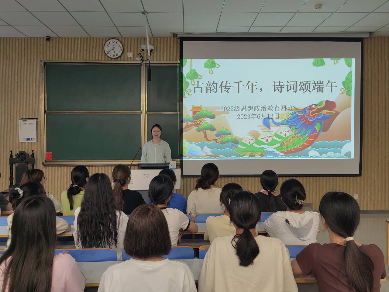 为帮助同学们进一步了解端午节习俗,弘扬中华文化,6月12日下午,ok138cn太阳集团5292022级思想政治教育四班在社科楼515教室召开“古韵传千年,诗词颂端午”主题班会,我院2022级思想政治教育四班全体同学参与本次班会。班长牛志杰主持本次班会。