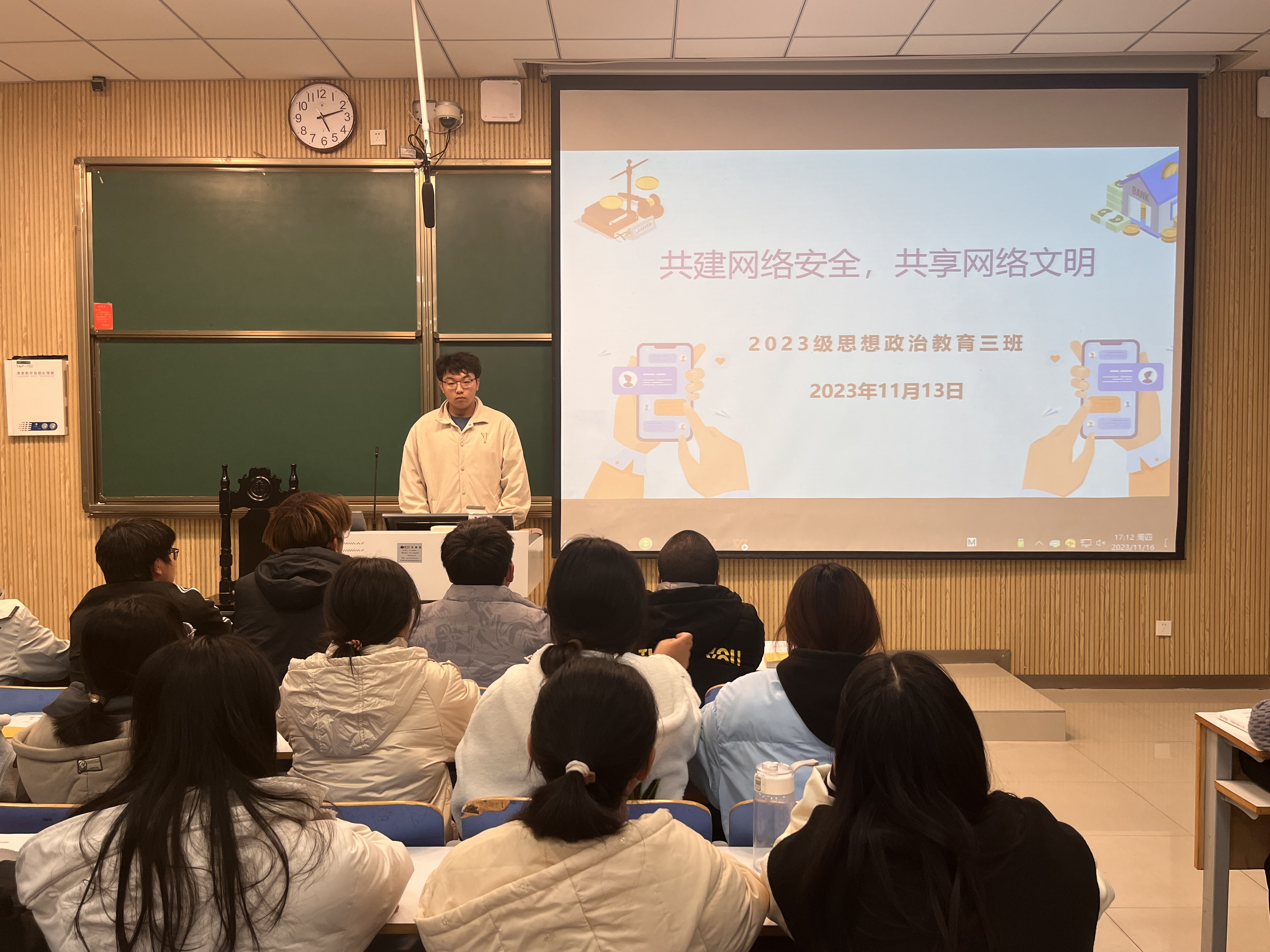 为宣传网络安全知识,避免不法言论对青年学子的误导,11月13日上午,ok138cn太阳集团5292023级思想政治教育三班在社科楼515教室召开“共建网络安全,共享网络文明”主题团课。我院2023级思想政治教育三班全体成员共同参加此次团课,团课由团支书郝瀚主持。